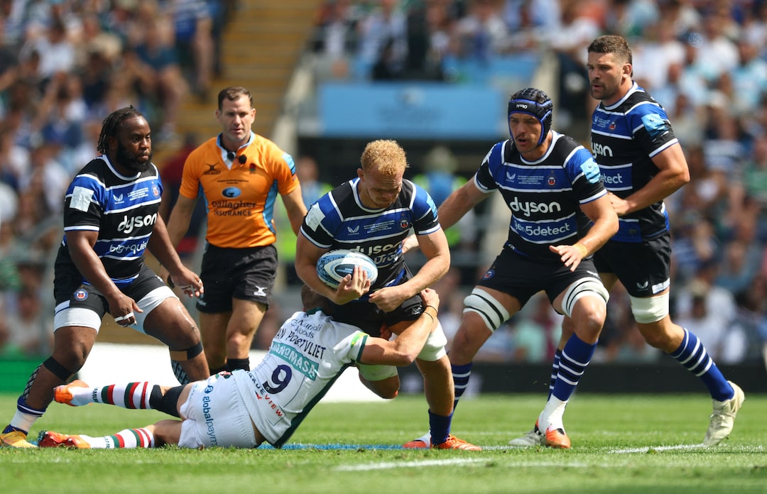 圖集1/2 橄欖球聯盟-英超橄欖球決賽-巴斯橄欖球俱樂部對陣萊斯特虎隊-英國倫敦特威克納姆安聯體育場-2025年6月14日 萊斯特虎隊的傑克·範·波特維利特與巴斯隊的邁爾斯·裏德在比賽中 動作圖片/馬修·柴爾茲/檔案照片
