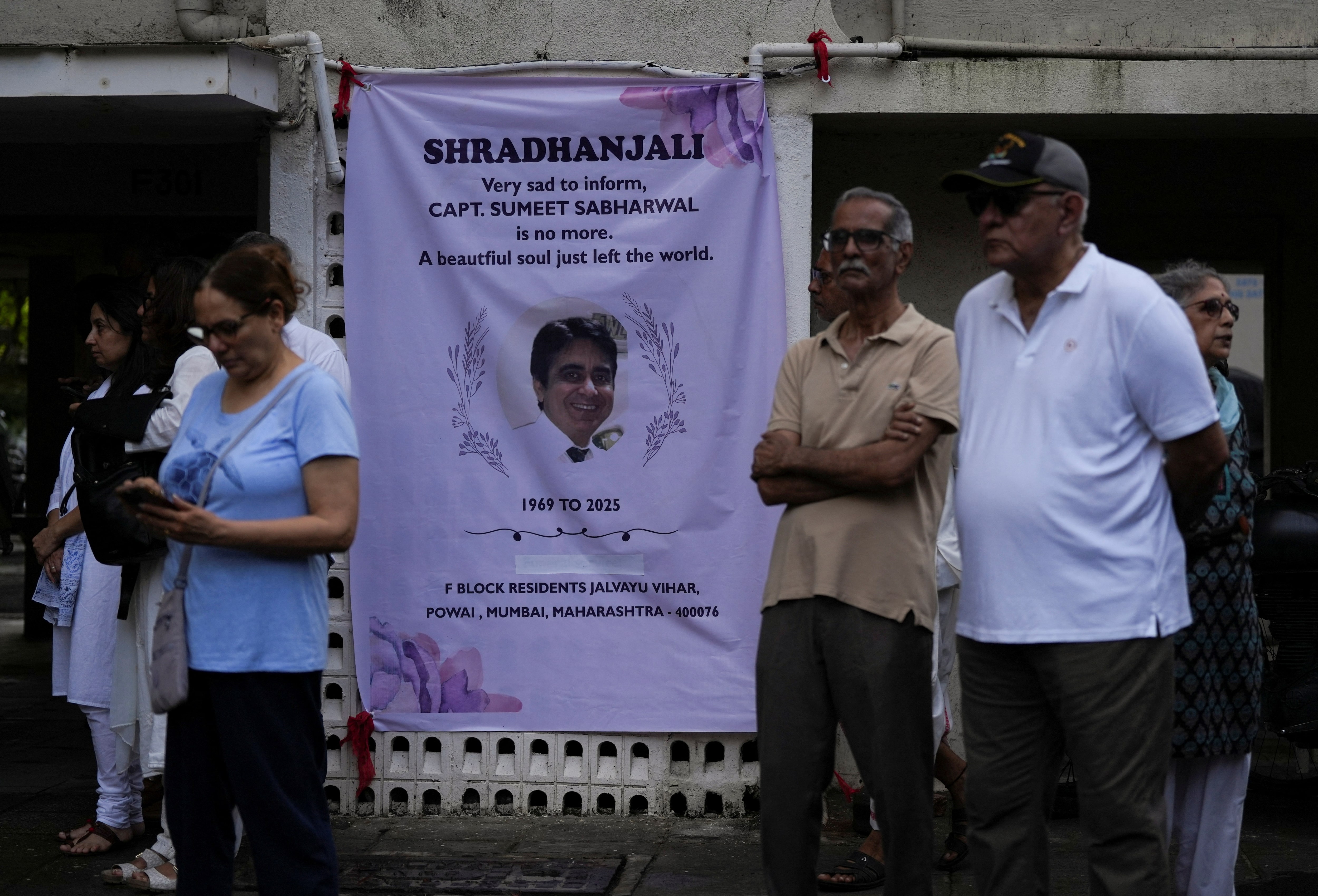 2025年6月17日,印度孟買,人們站在悼念橫幅旁等待遇難飛行員蘇米特·薩巴瓦爾(Sumeet Sabharwal)的遺體移交其家屬。該飛行員駕駛的印度航空波音787-8夢幻客機在起飛時墜毀。路透社/Hemanshi Kamani 購買授權許可,打開新標籤頁新德里,6月17日(路透社)——政府備忘錄顯示,印度航空安全監管機構已要求印度航空提供上週墜毀飛機的飛行員和調度員的培訓記錄,作為對造成至少271人遇難事故調查的一部分。