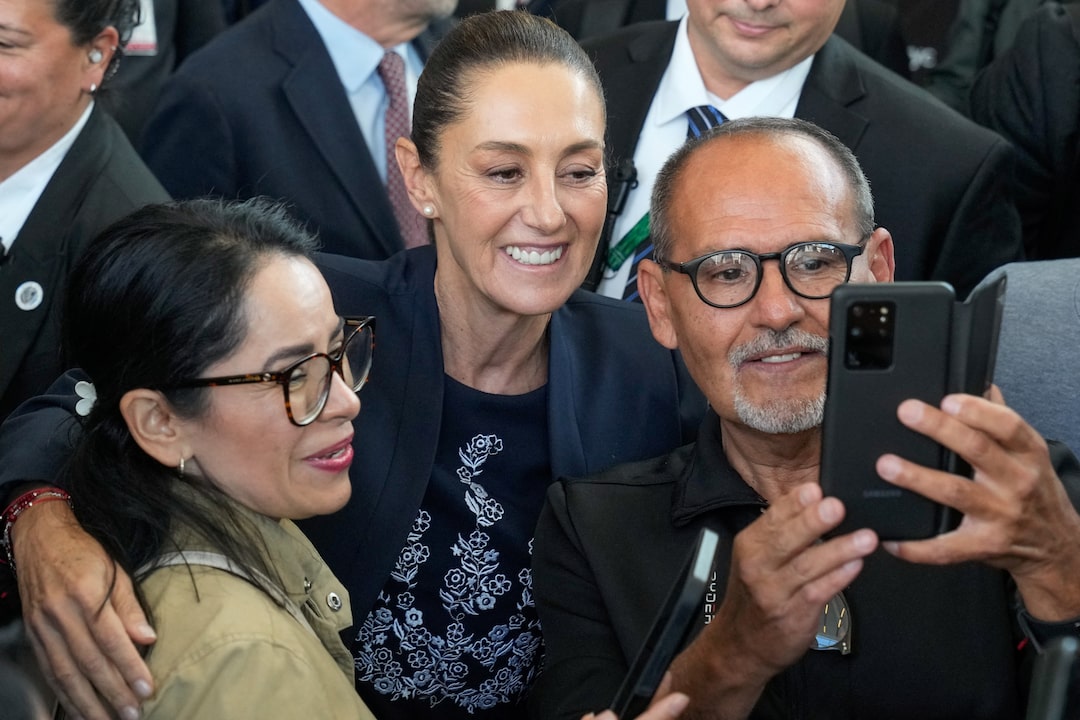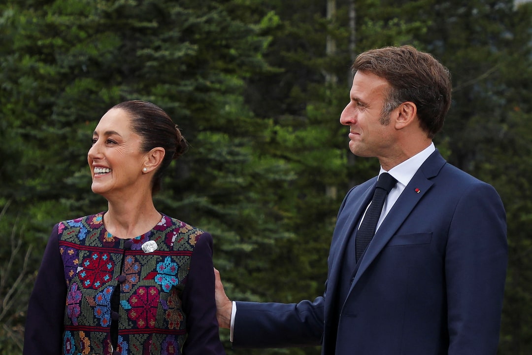 圖集1/2:墨西哥總統克勞迪婭·辛鮑姆與法國總統埃馬紐埃爾·馬克龍在加拿大阿爾伯塔省卡納納斯基斯舉行的G7峯會官方合影前的週二照片,2025年6月17日。路透社/安伯·布拉肯