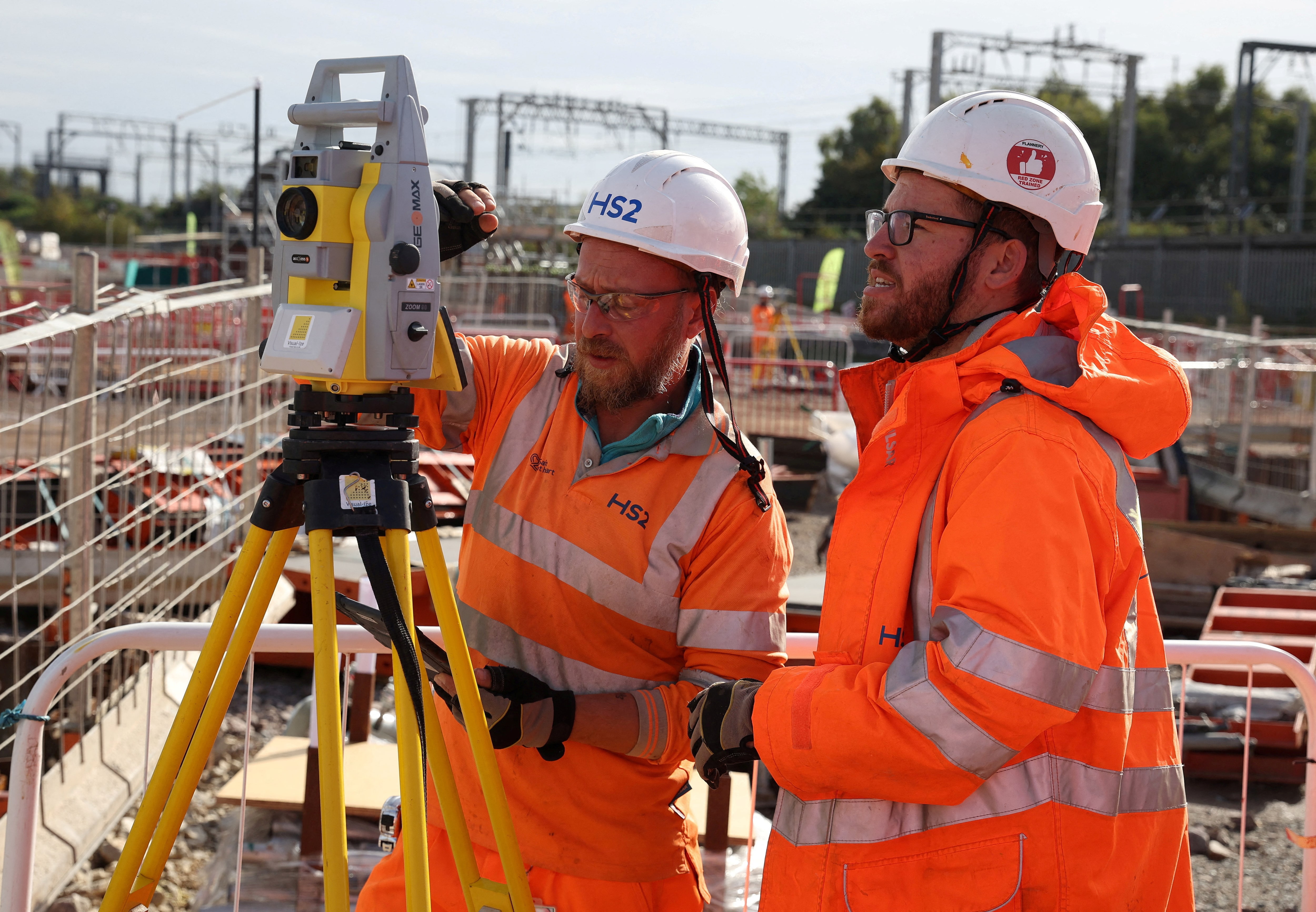 2022年10月3日,英國伯明翰,工人們在HS2鐵路庫松街站建設工地操作測量設備。路透社/菲爾·諾布爾/資料圖片購買授權權利,打開新標籤頁倫敦,6月18日(路透社)——據英國廣播公司週三報道,英國新的高速鐵路線HS2將連接倫敦和英格蘭中部城市伯明翰,其開通日期將從原定的2033年推遲。