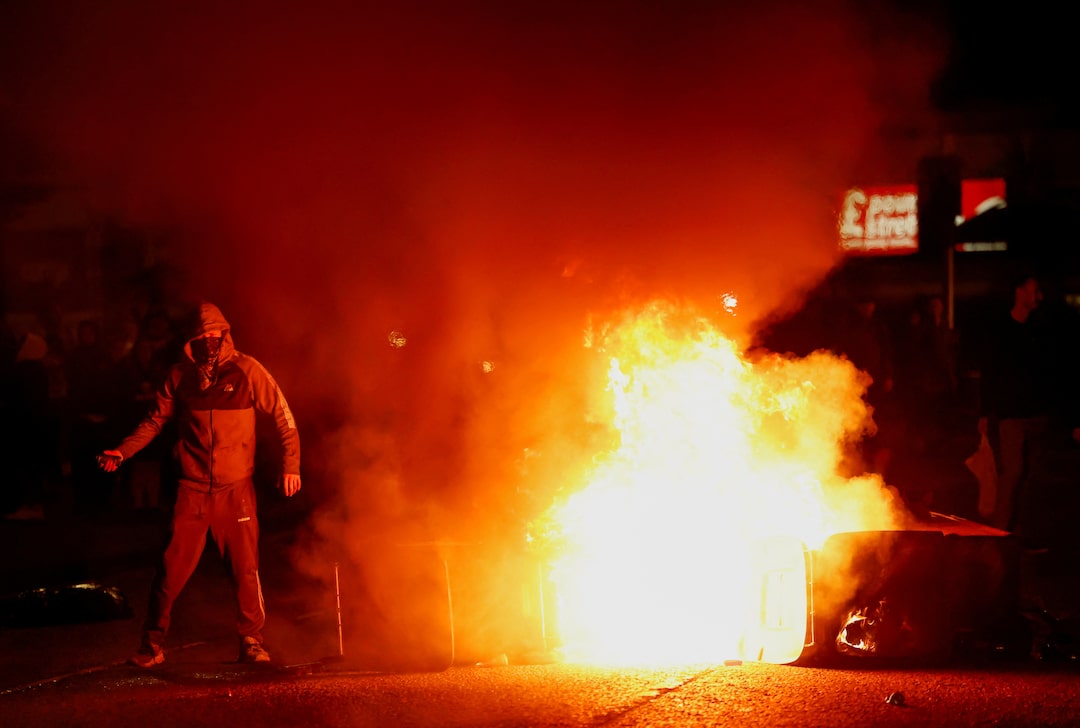 2025年6月11日,北愛爾蘭巴利米納持續騷亂中,一名蒙面示威者附近燃起大火。路透社/克洛達·基爾科因/資料圖片