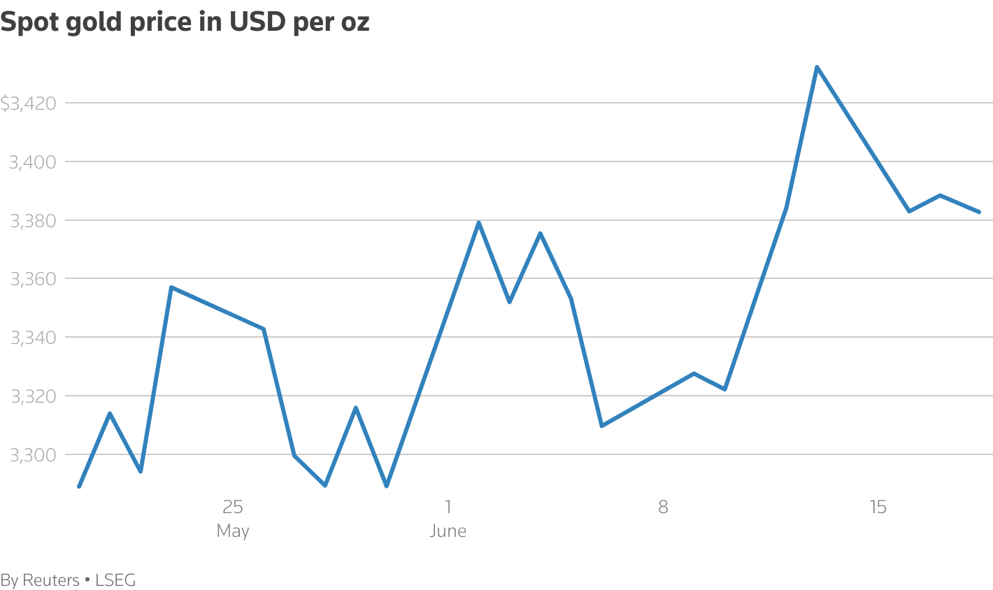 6月18日(路透社)——週三黃金價格下跌,因投資者在美聯儲貨幣政策決定前避免進行重大押注,同時密切關注以色列與伊朗衝突的進展。