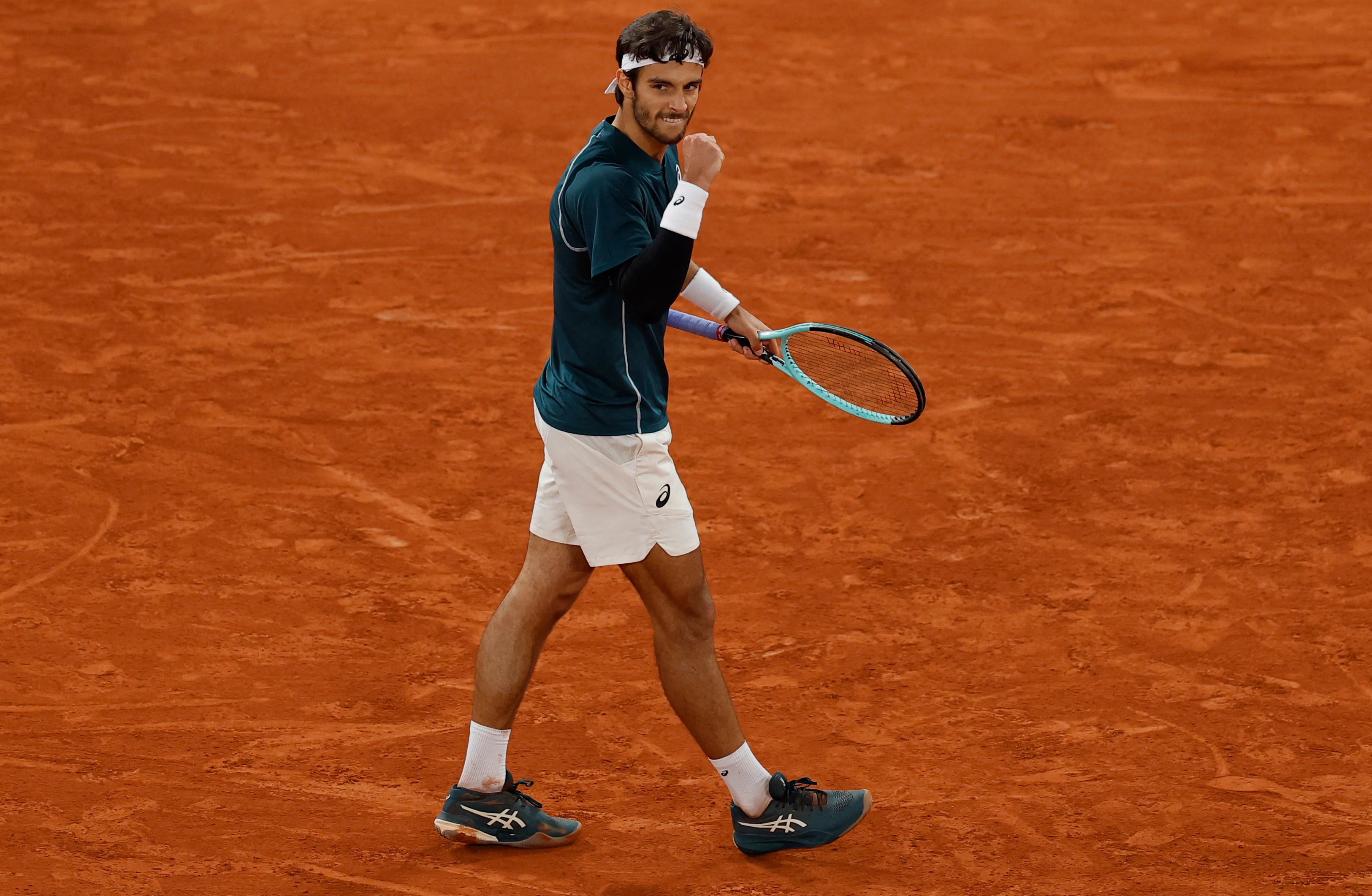 法國網球公開賽期間,洛倫佐·穆塞蒂在比賽中反應的歷史檔案照片。2025年6月6日,法國巴黎,羅蘭·加洛斯。