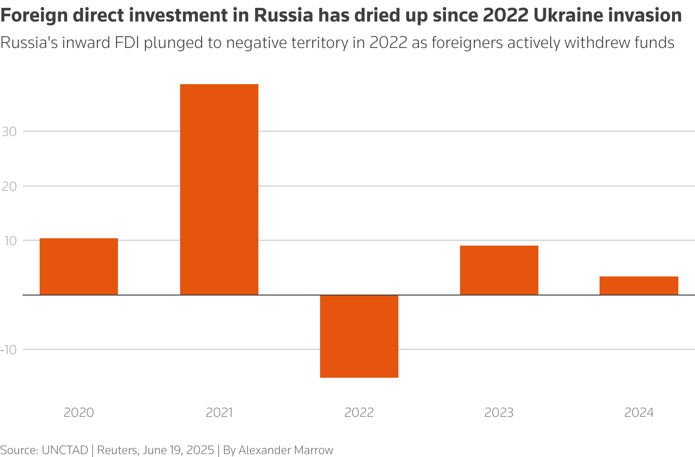但儘管有諸多關於新戰略伙伴關係的討論,央行數據顯示,自俄烏衝突爆發以來,俄羅斯的外資持有量已幾乎減半至5960億美元。聯合國貿易和發展會議週四公佈的數據顯示,2024年俄羅斯外商直接投資(FDI)流入量同比下降62.8%,降至33.5億美元。