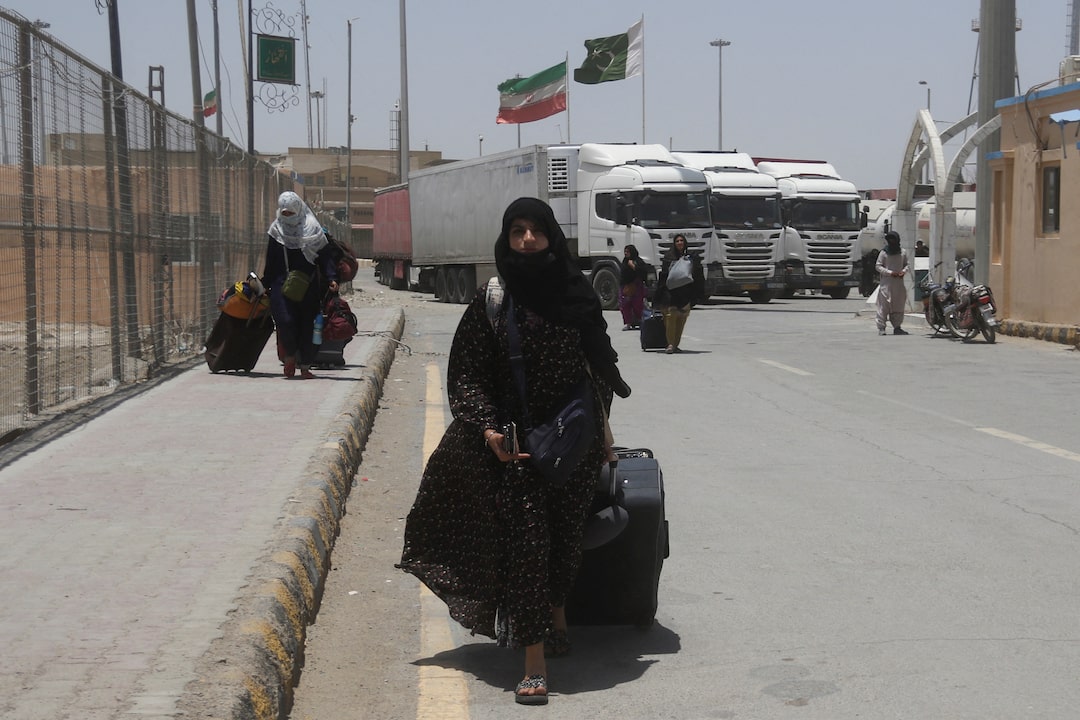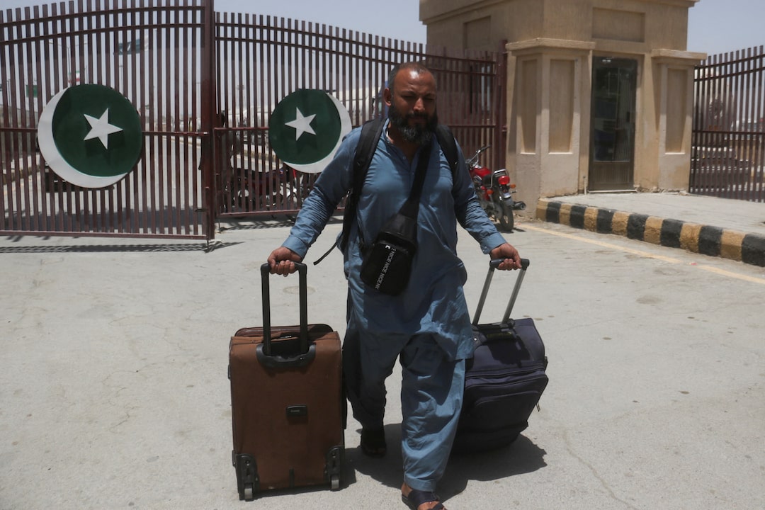 圖1/5:2025年6月19日,巴基斯坦朝聖者帶着行李從伊朗返回,此前伊朗遭到以色列襲擊,攝於巴基斯坦塔夫坦的巴基斯坦-伊朗邊境口岸。路透社/Naseer Ahmed