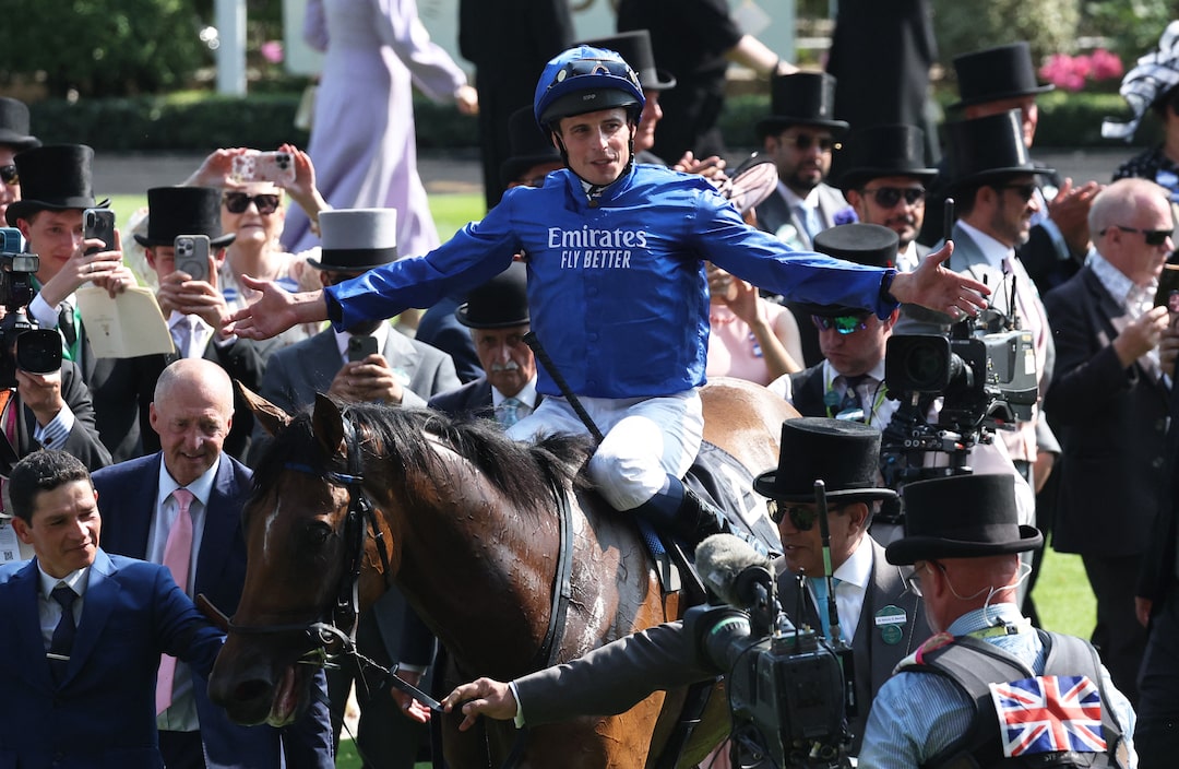5項賽事之1 賽馬 - 2025皇家阿斯科特賽馬會 - 英國阿斯科特賽馬場 - 2025年6月19日 特拉沃爾曼的騎師威廉·別克慶祝贏得16:20金盃賽 路透社/保羅·柴爾茲通過Action Images提供