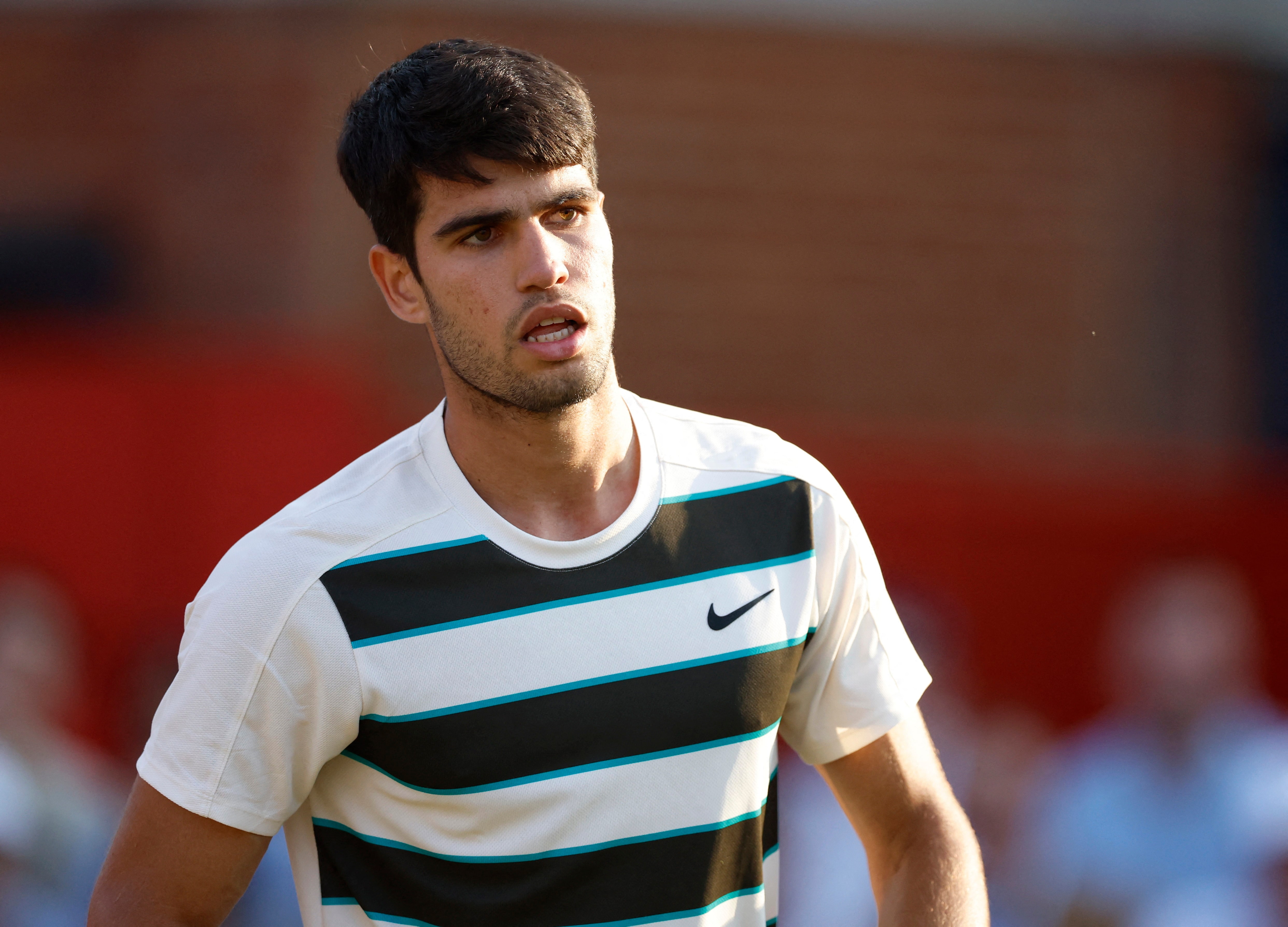 西班牙選手卡洛斯·阿爾卡拉斯在週四倫敦女王杯網球賽中對陣雅奧米·穆納爾的比賽。攝影:彼得·澤博拉 - 路透社購買授權權利,打開新標籤頁倫敦6月19日(阿拉伯路透體育服務)——世界排名第一的西班牙選手卡洛斯·阿爾卡拉斯週四在女王杯網球賽的一場激烈比賽中,以6-4、6-7、7-5艱難戰勝同胞雅奧米·穆納爾,晉級八強。
