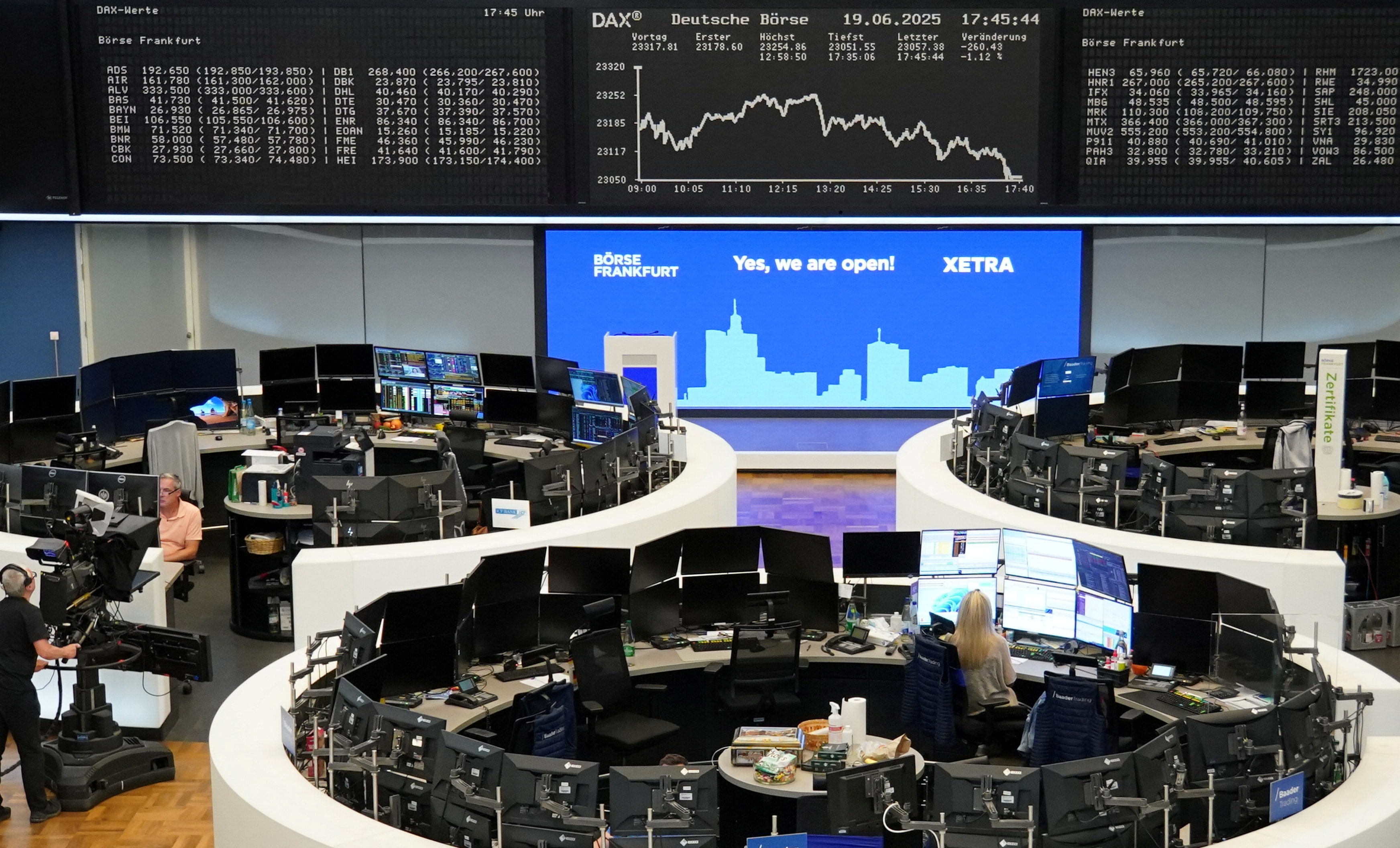 2025年6月19日,德國法蘭克福證券交易所展示的德國DAX股價指數走勢圖。路透社/員工/檔案照片購買授權許可,打開新標籤頁由Stella Qiu帶來的歐洲及全球市場每日前瞻