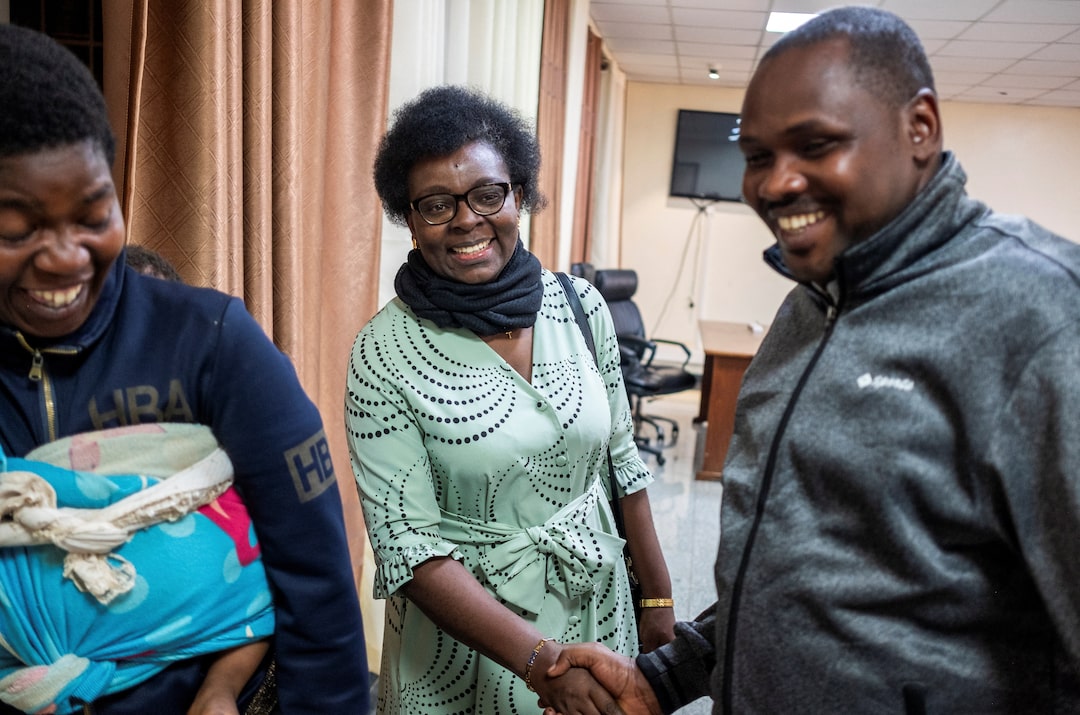 圖集1/3:2025年6月19日,盧旺達未註冊政黨"全民發展與自由黨"(DALFA)領袖、反對派政治家維多利亞·英加比雷在基加利高等法院內與盧旺達律師兼反對派政治家伯納德·恩塔甘達交談。路透社/讓·比齊馬納