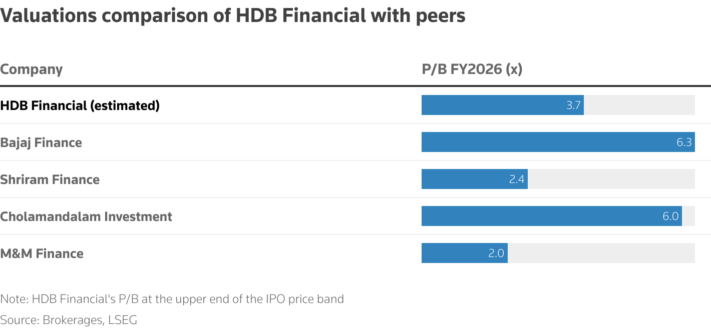 每股740盧比的定價使HDB的市淨率(估值關鍵指標)達到3.72倍,與Bajaj金融(BJFN.NS),新窗口打開及Shriram金融(SHMF.NS),新窗口打開等同行持平。