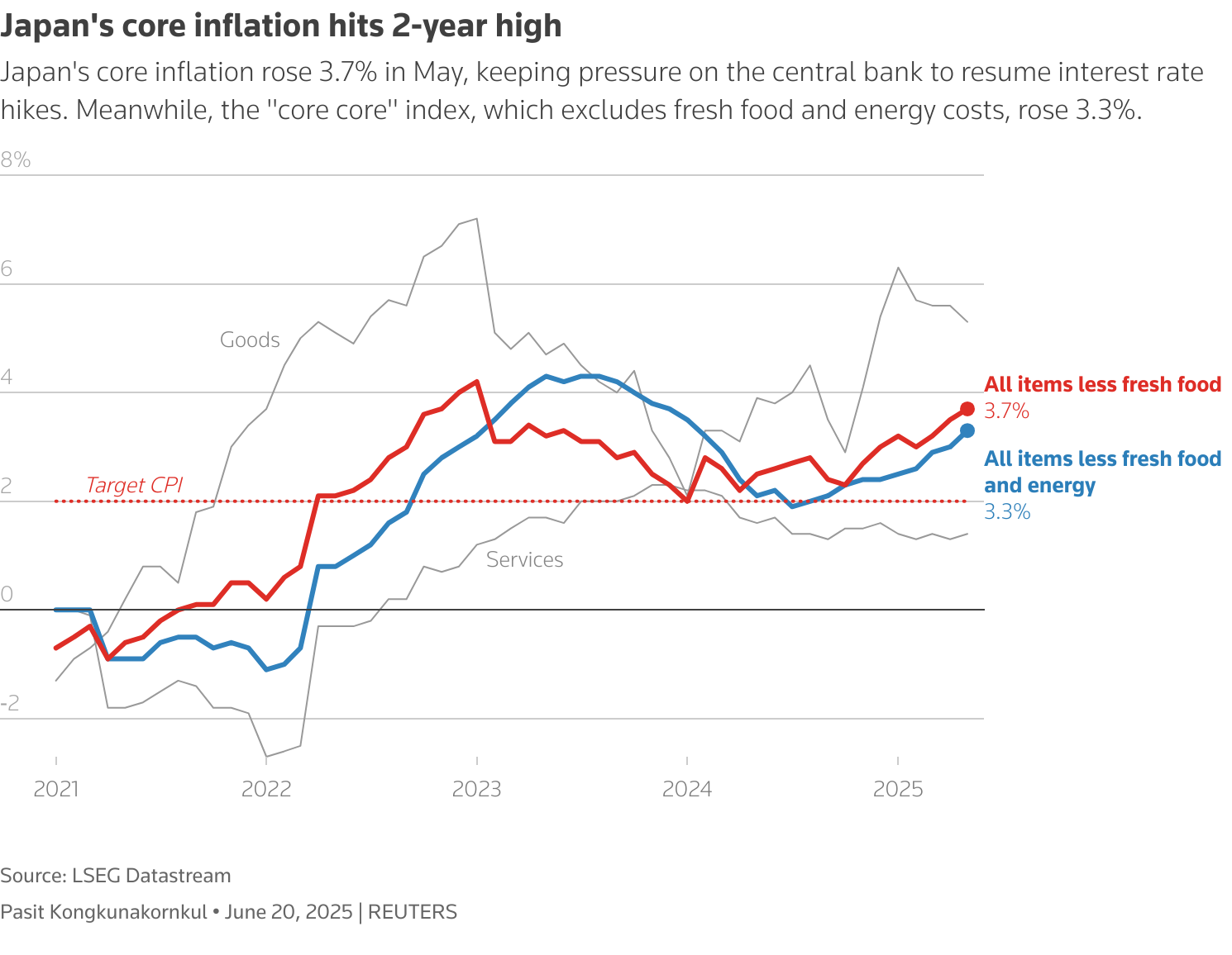 東京,6月20日(路透社)——日本核心通脹率在5月達到兩年多來的最高水平,連續三年多超過2%的目標,儘管面臨關税帶來的經濟壓力,這仍使央行承受恢復加息的壓力。