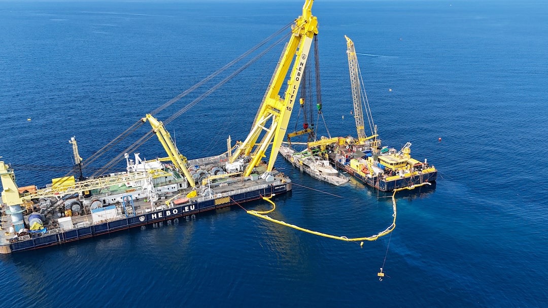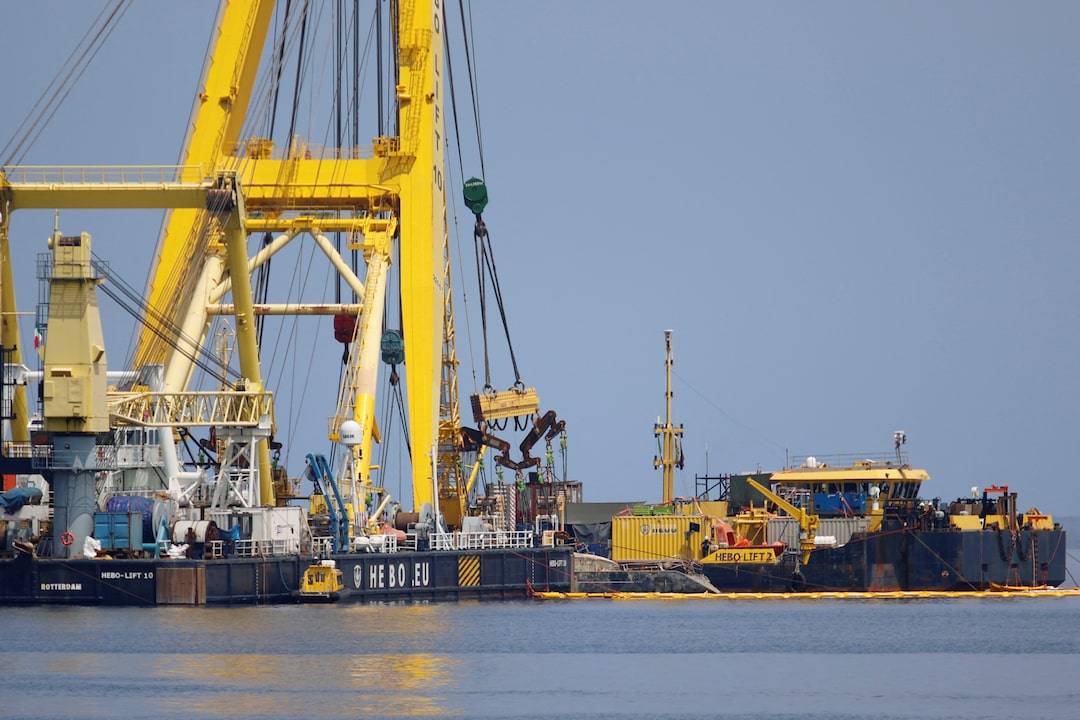 圖1/5:2025年6月20日,無人機航拍顯示浮吊船HEBO LIFT 10和HEBO LIFT 2正在打撈英國科技企業家邁克·林奇(Mike Lynch)的"貝葉斯號"遊艇。該遊艇在意大利西西里島巴勒莫附近Porticello海域沉沒,導致林奇遇難。路透社/Danilo Arnone