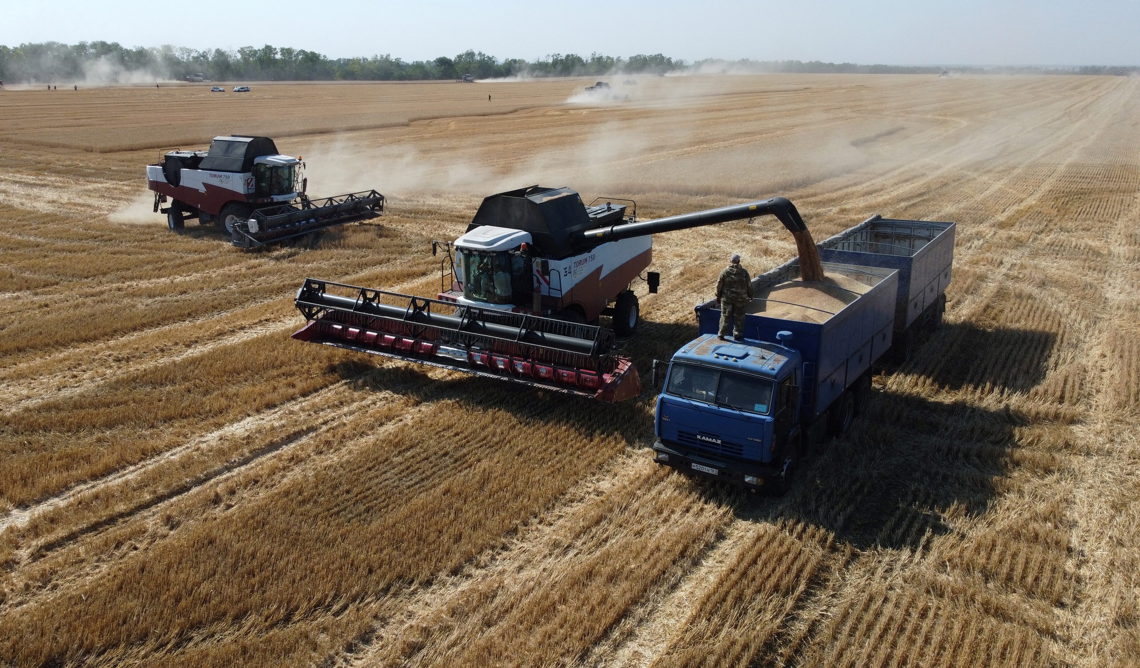 無人機拍攝的照片顯示,2024年7月9日俄羅斯羅斯托夫地區麥田中正在收割小麥的聯合收割機。拍攝:謝爾蓋·皮沃瓦羅夫 - 路透社購買授權許可,打開新標籤頁聖彼得堡(俄羅斯)6月20日(路透社) - 俄羅斯總統弗拉基米爾·普京週五表示,作為全球最大小麥出口國的俄羅斯與巴林計劃在阿拉伯灣建立一個小麥貿易中心。