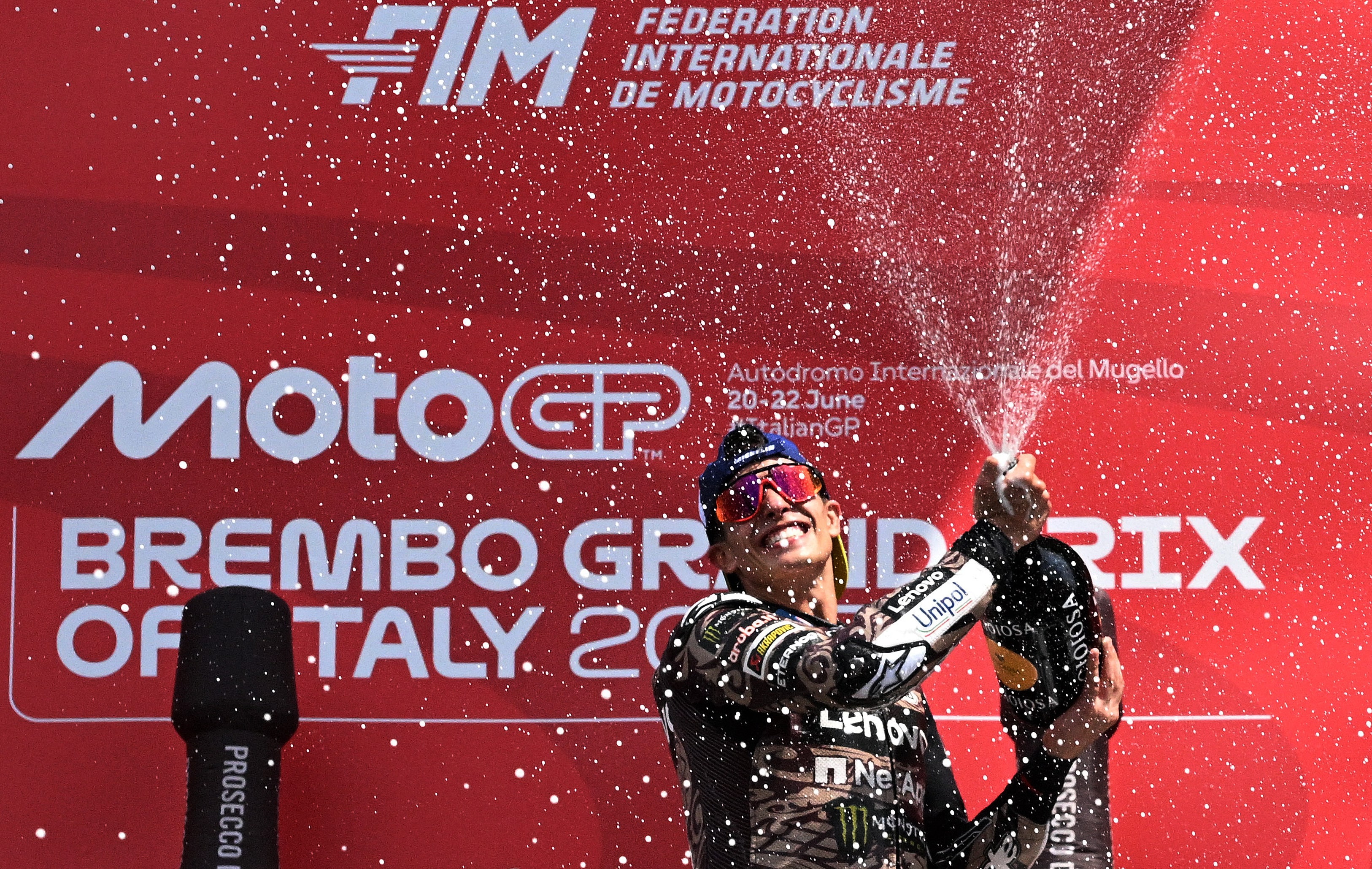 杜卡迪車隊車手馬克·馬克斯在2025年6月22日穆傑羅賽道贏得意大利摩托車大獎賽後於領獎台上慶祝。攝影:詹妮弗·洛倫齊尼 - 路透社購買授權許可,打開新標籤頁意大利斯卡爾佩里亞聖皮耶羅(阿拉伯路透體育服務)2025年6月22日 - 杜卡迪車隊車手馬克·馬克斯在週日的穆傑羅賽道激烈角逐後贏得意大利摩托車大獎賽,超越弟弟亞歷克斯,鞏固了他在世界摩托車錦標賽中的領先地位。