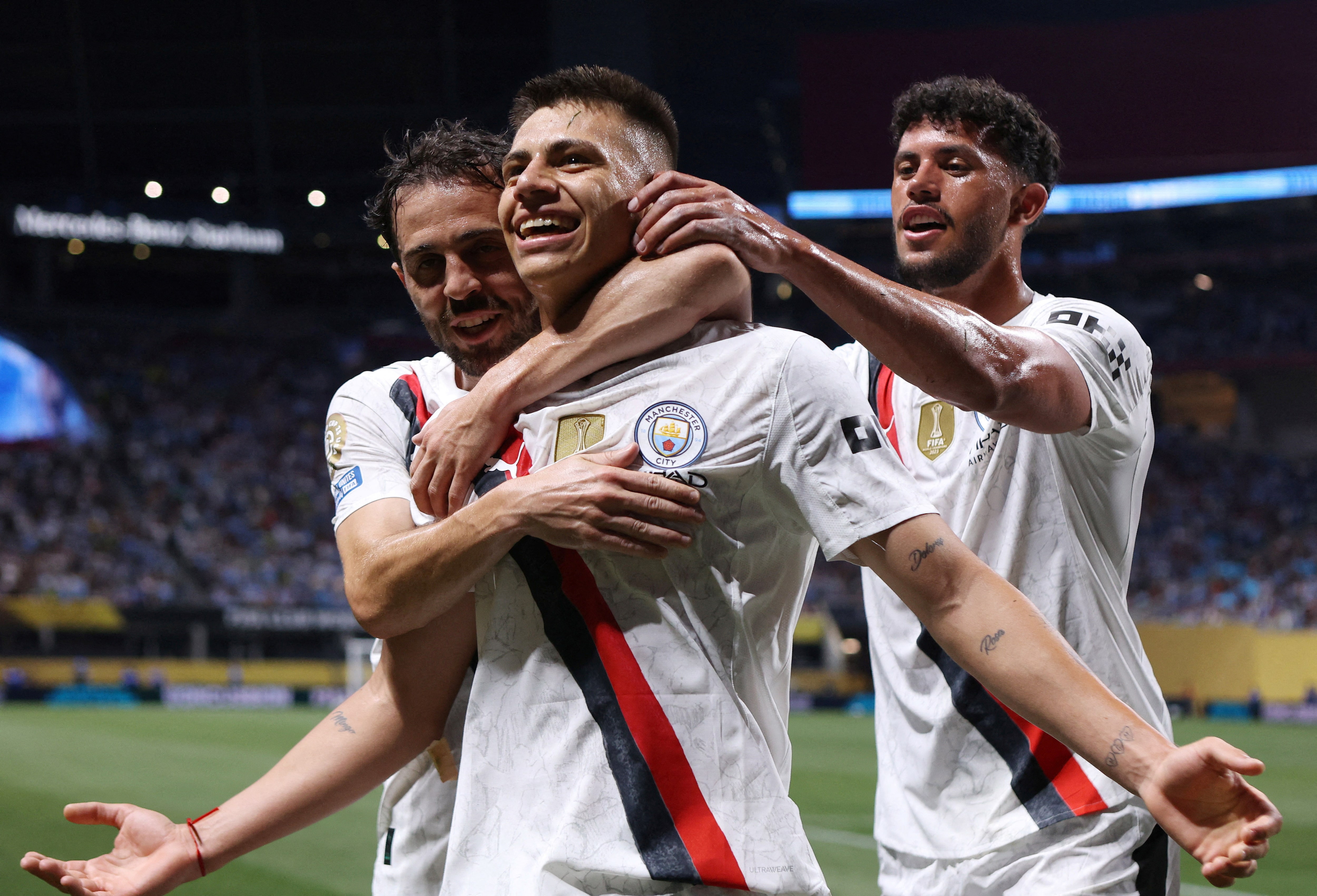 曼城球員克勞迪奧·埃切維裏與隊友慶祝他在世俱杯對陣阿聯酋阿爾艾因隊時通過任意球打入的第二粒進球。拍攝:佈雷特·戴維斯 - 路透社購買授權權利,打開新標籤頁亞特蘭大(喬治亞州)6月23日電(阿拉伯路透體育服務)——阿聯酋阿爾艾因隊在本週一第七小組第二輪比賽中以0-6慘敗於英格蘭曼城隊後,告別了世俱杯賽場。