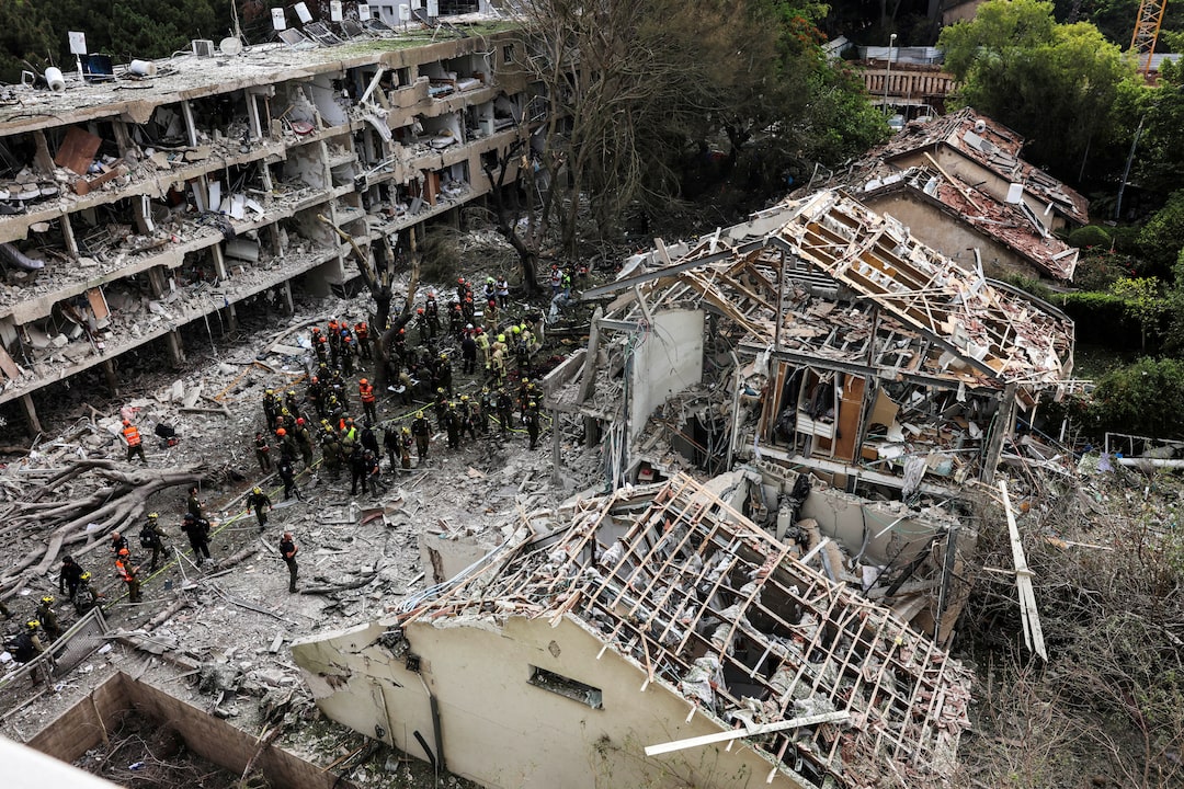 圖集1/2 2025年6月22日,在伊朗與以色列衝突期間,救援人員和安全人員在以色列特拉維夫遭伊朗導彈襲擊後的現場展開救援。路透社/Tomer Appelbaum