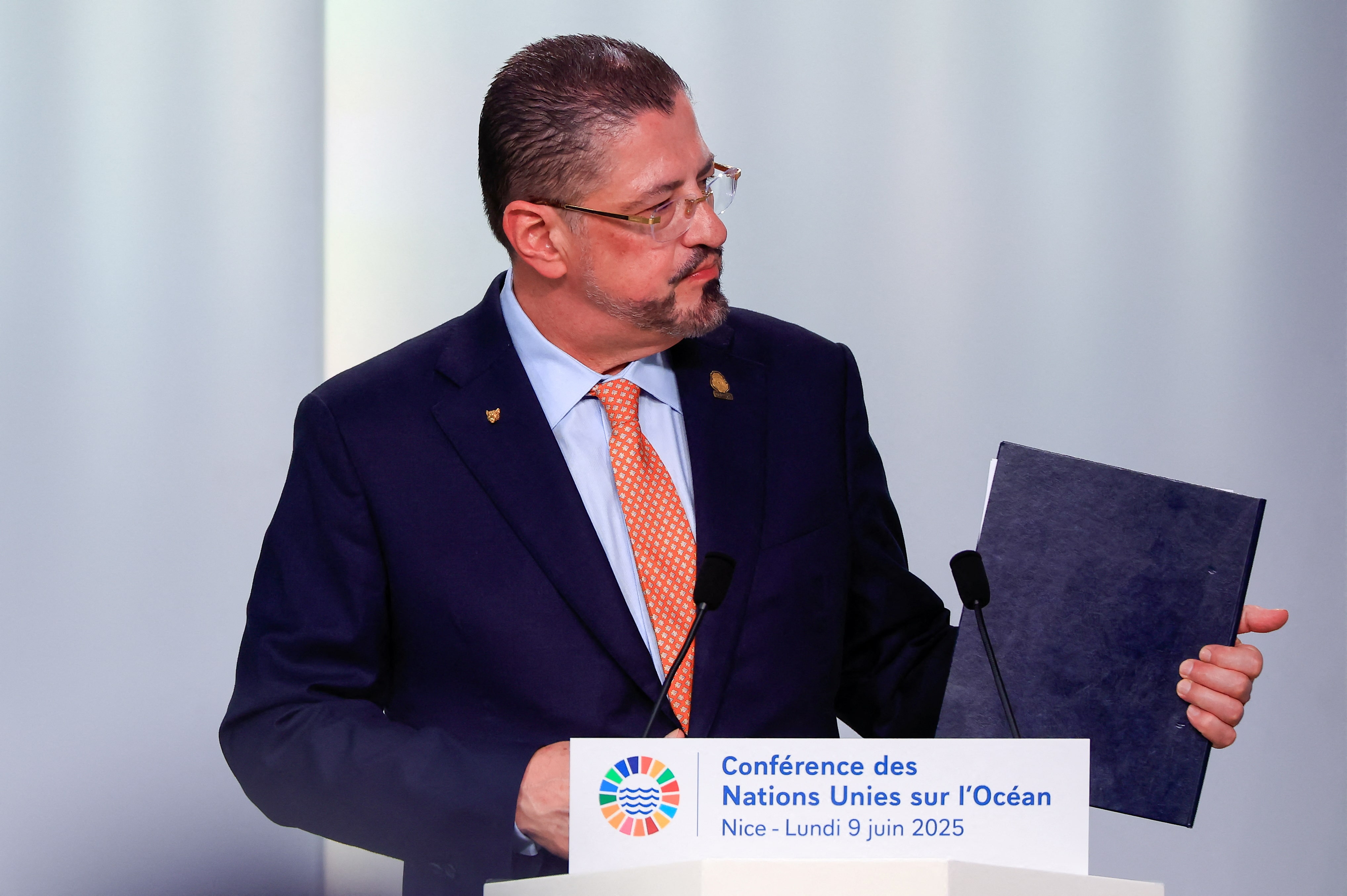 2025年6月9日,哥斯達黎加總統羅德里戈·查韋斯·羅夫萊斯在法國尼斯會展中心舉行的第三屆聯合國海洋大會(UNOC3)全體會議上發表演講。此次會議匯聚了各國領導人、研究人員和活動家,共同探討如何保護海洋生物。路透社/馬農·克魯茲/檔案…購買授權許可,打開新標籤頁閲讀更多路透社聖何塞6月23日電 - 哥斯達黎加總檢察長辦公室週一以非法競選資金罪名起訴總統羅德里戈·查韋斯及其他六名政府官員,要求最高法院取消總統豁免權並對其進行審判。