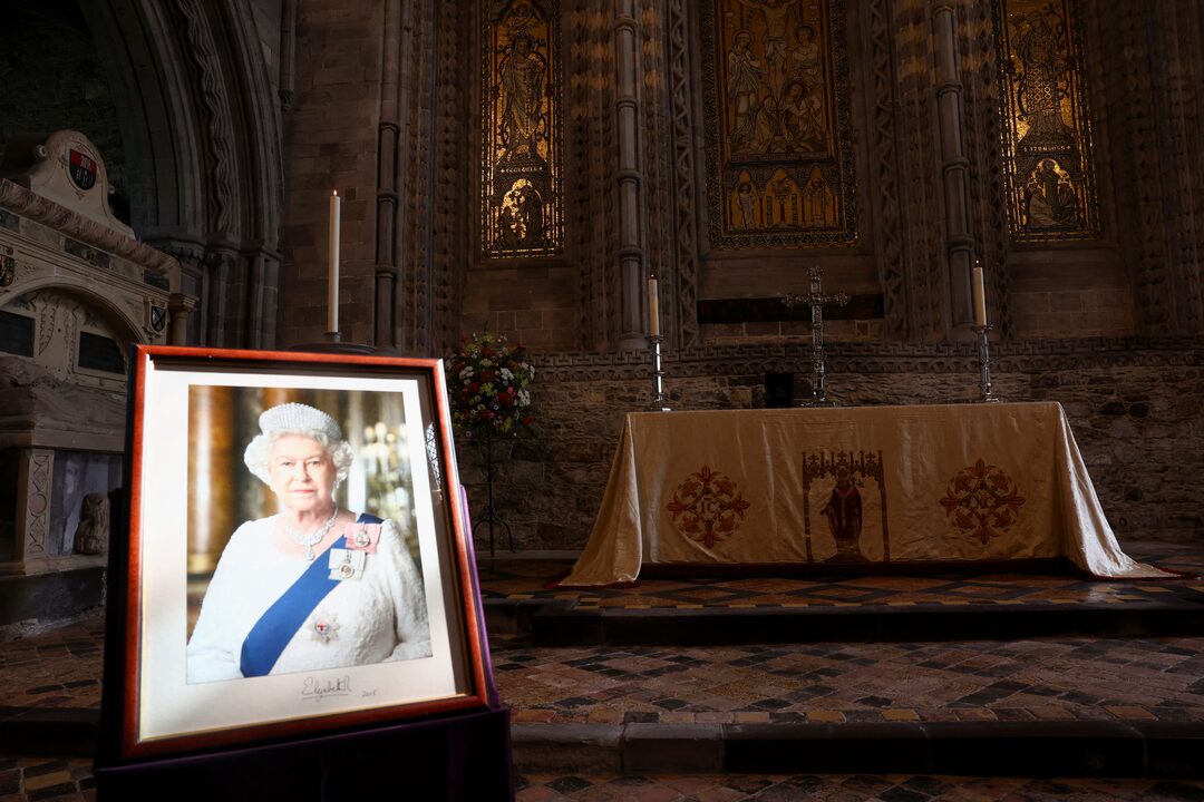 圖集1/2 2023年9月8日,英國威爾士聖大衞大教堂內,在威爾士親王威廉與威爾士王妃凱瑟琳抵達前,展出了一幅英國女王伊麗莎白的肖像,以紀念女王逝世一週年。路透社/Toby Melville/Pool