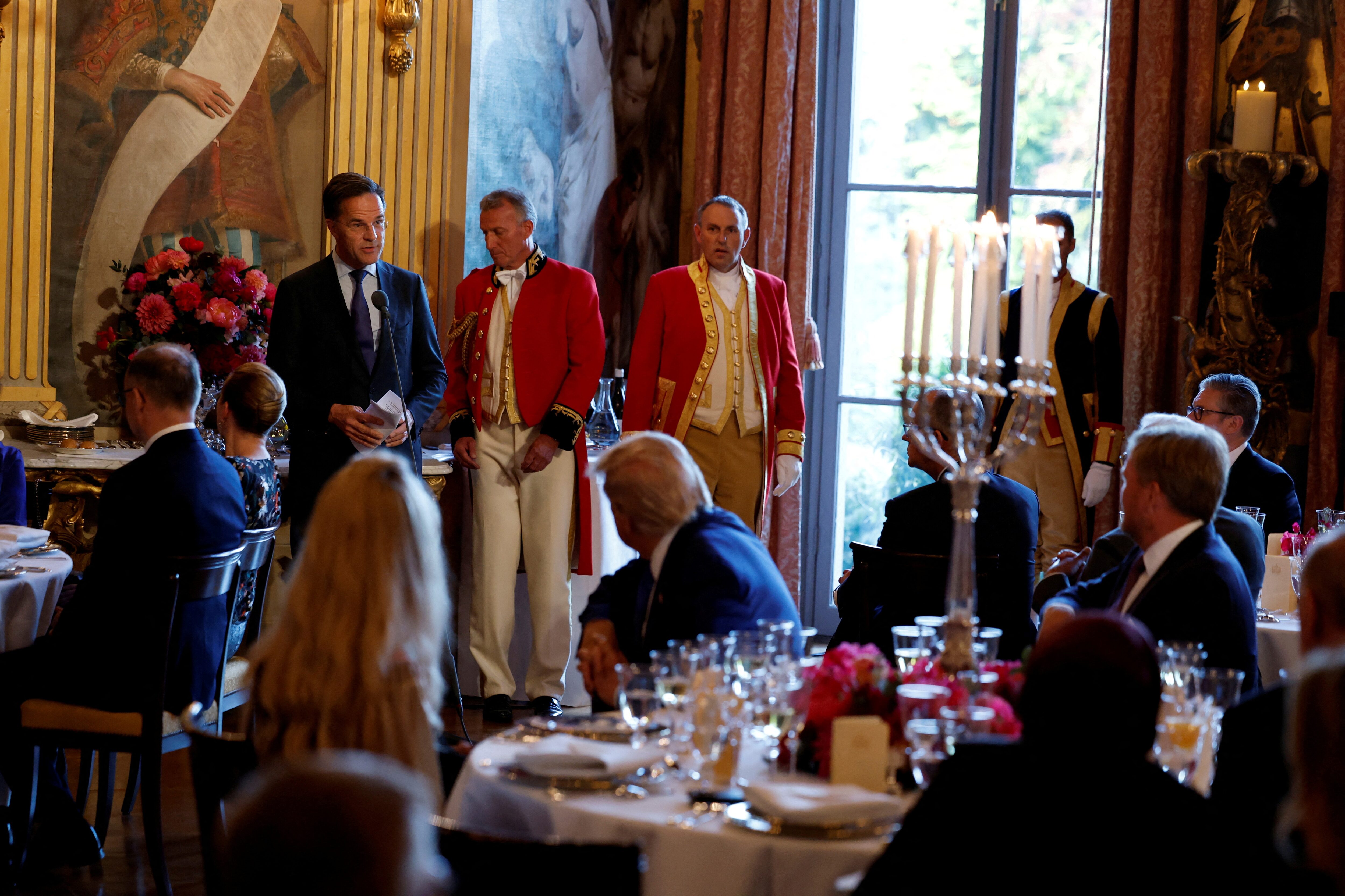 美國總統唐納德·特朗普於2025年6月24日在海牙北約領導人晚宴上聆聽北約秘書長馬克·魯特的講話。路透社通過新聞機構代表提供的圖片。購買許可權利,打開新標籤頁海牙6月25日(路透社)——北約成員國領導人週三在海牙舉行特別峯會,專為美國總統唐納德·特朗普召開,歐洲盟友希望增加國防開支的承諾能消除他對北約承諾的疑慮。