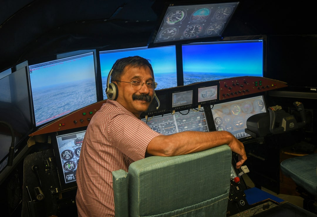 2025年6月23日,印度班加羅爾,退役印度空軍(IAF)聯隊指揮官K·迪內什在Cockpit Vista接受路透社採訪後,在駕駛艙模擬器室內擺姿勢拍照。路透社/梅加納·薩斯特里