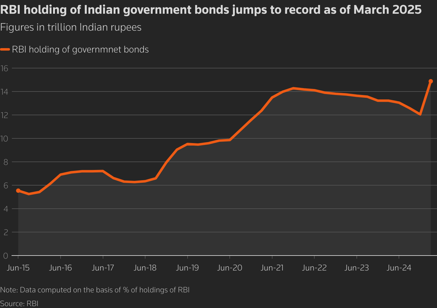根據週三公佈的央行數據,截至3月底,印度儲備銀行的債券持有量佔未償還發行量的比例從12月底的10.55%上升至12.78%。