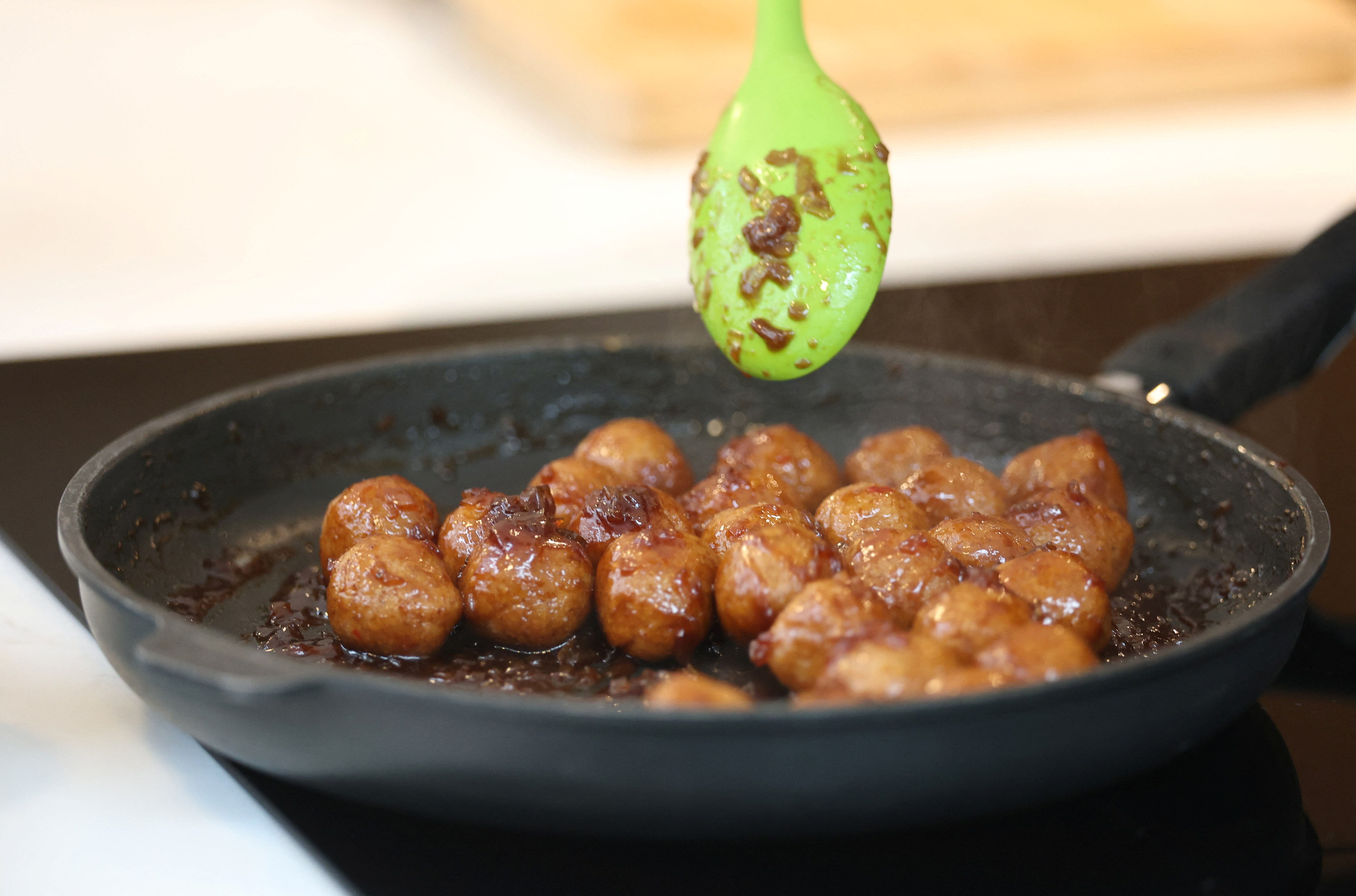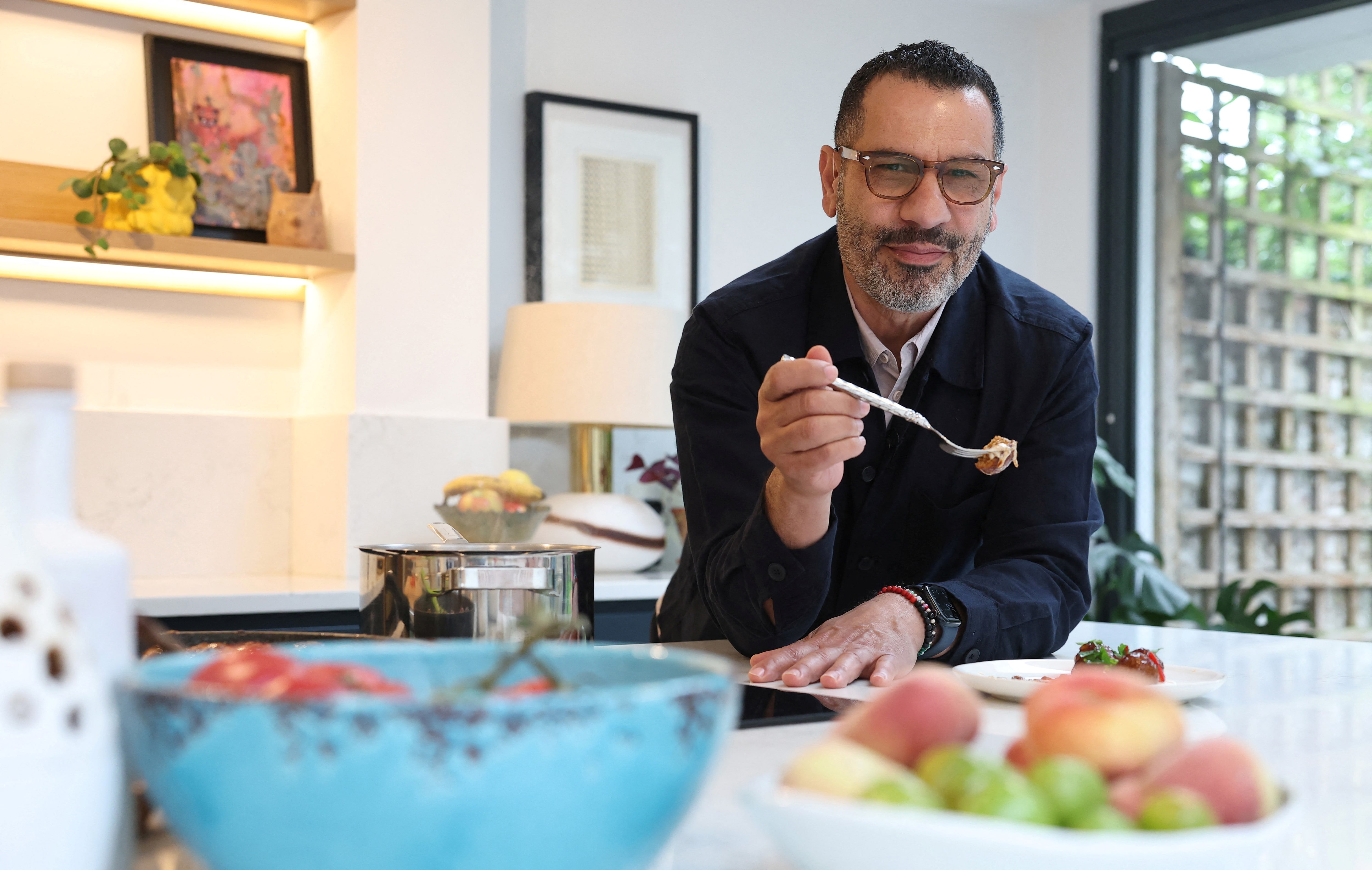 巴勒斯坦裔英國廚師、美食作家和餐館老闆薩米·塔米米於2025年6月3日在倫敦家中接受路透社採訪時,準備了他新烹飪書中的一道布爾古爾庫貝菜餚。路透社/託比·梅爾維爾