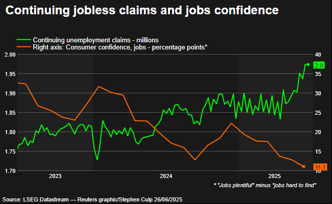 紐約,6月26日(路透社)——華爾街週四收高,標普500指數和納斯達克指數接近收盤紀錄,因以色列和伊朗之間的停火持續維持,一系列經濟指標似乎支持美聯儲今年降低貸款成本的觀點。
