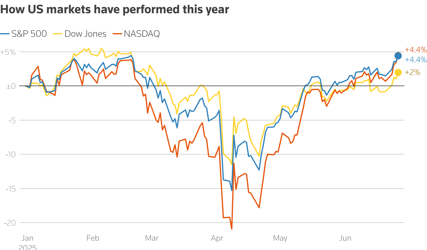 華爾街率先領漲,投資者紛紛抓住最新利好消息:脆弱的停火協議在以色列與伊朗之間持續生效,中美貿易緊張局勢也出現進一步緩和的初步跡象。廣告·繼續滾動隨着美聯儲主席可能轉向更鴿派立場以及美國經濟數據持續疲軟,市場對美聯儲更多降息的預期也在上升。貿易方面,白宮官員週四表示美國已與中國就加快稀土運輸達成協議。另一利好消息是,美國財政部長斯科特·貝森特要求國會共和黨人從全面預算法案中刪除針對外國投資者的"報復性税收"條款。