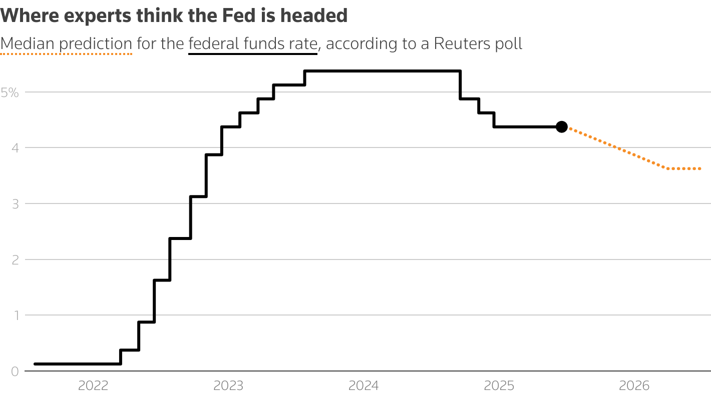 線形圖顯示聯邦基金利率目標中值及路透調查預測中位數。