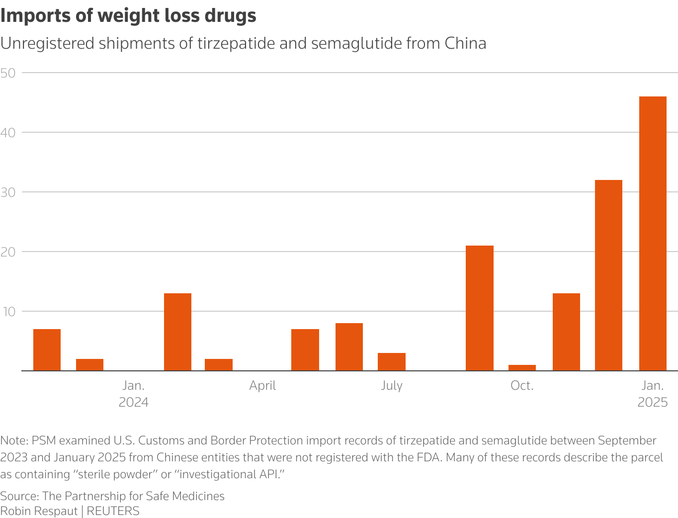 柱狀圖顯示來自中國的未註冊替爾澤肽和司美格魯肽的運輸情況。