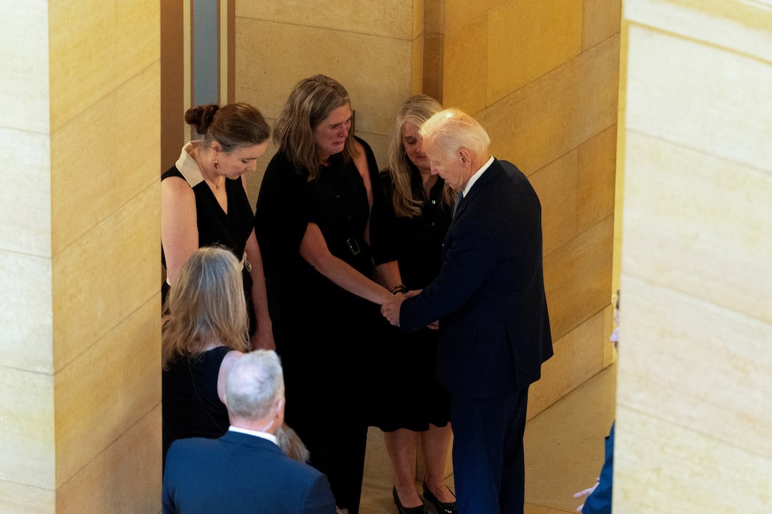 拜登總統於傍晚抵達州議會大廈。出於安全考慮清空圓形大廳後,這位民主黨籍前總統獨自入內。他在靈柩前靜默片刻後離去。