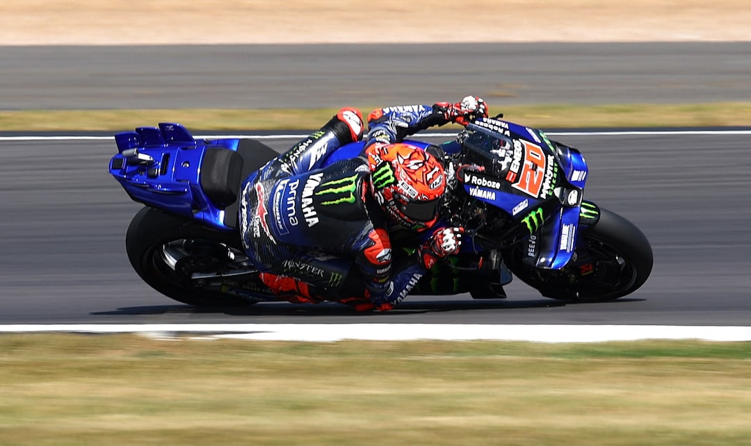 圖集第1張(共2張) 2025年5月25日,英國銀石賽道,MotoGP英國大獎賽,Monster Energy雅馬哈車隊車手法比奧·誇塔拉羅在比賽中馳騁。路透社Action Images/Andrew Boyers/資料圖片
