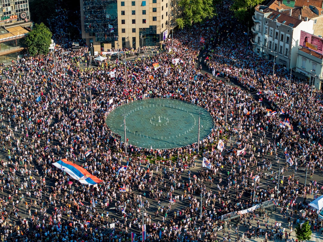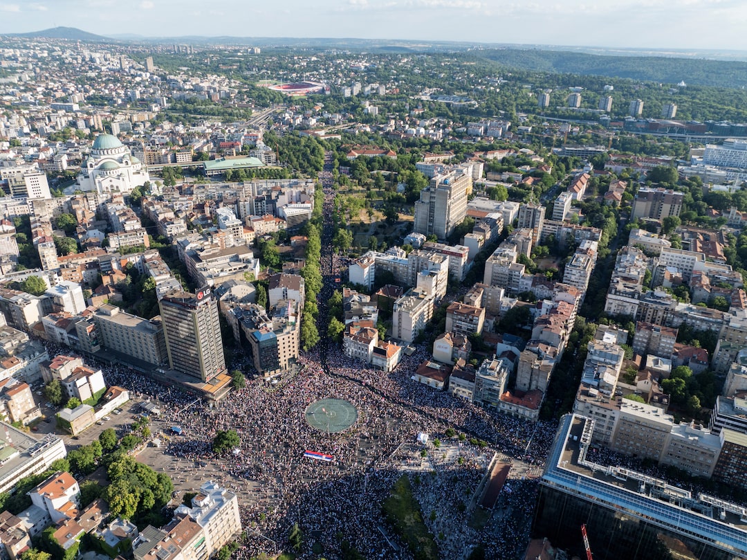 5張圖片中的第1張 2025年6月28日,塞爾維亞貝爾格萊德斯拉維亞廣場,無人機航拍畫面顯示,塞爾維亞學生及其他示威者參加反政府抗議活動,要求提前舉行選舉。路透社/Djordje Kojadinovic