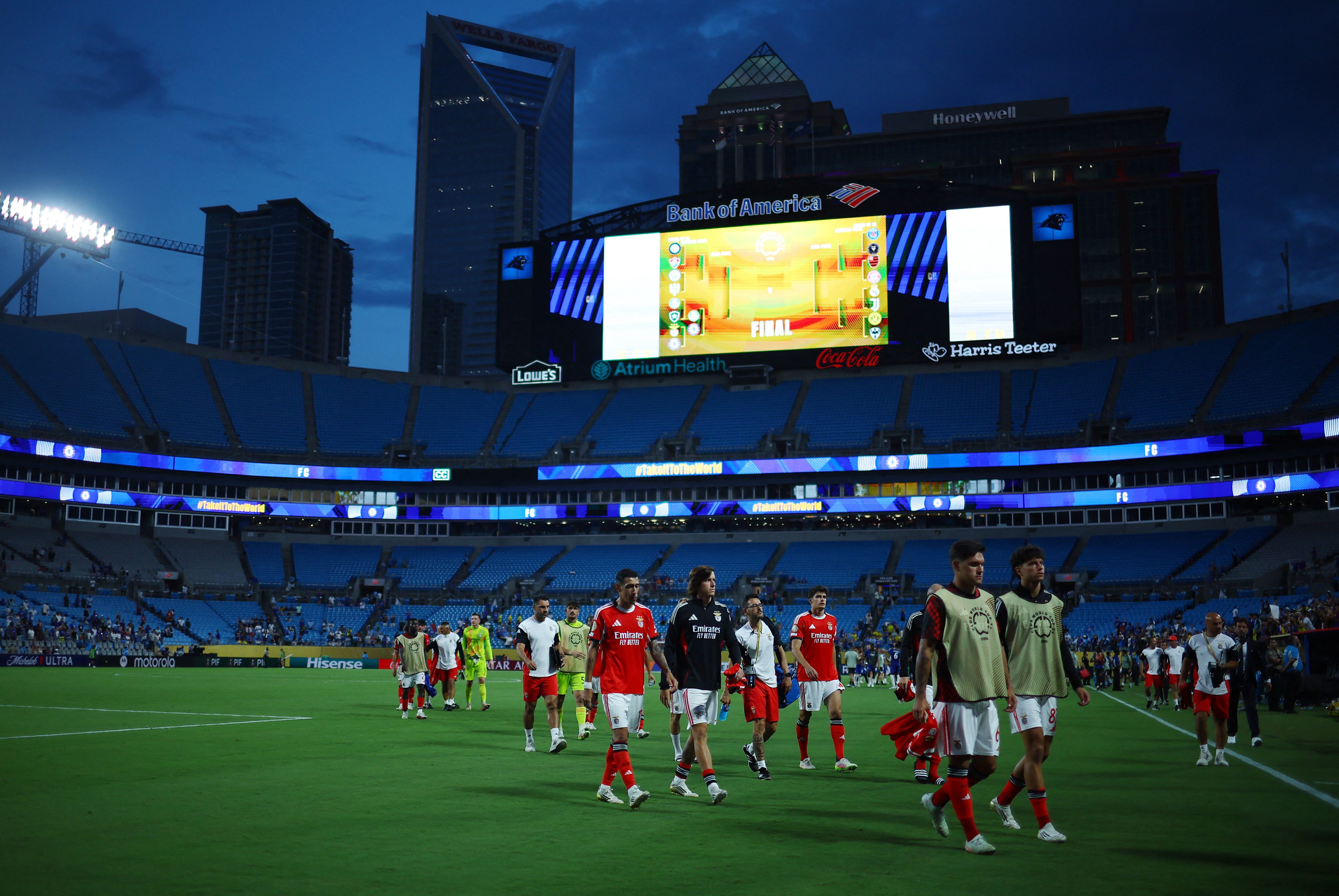 2025年6月28日,本菲卡球員在世界盃俱樂部足球賽十六強對陣切爾西后表現沮喪。攝影:奧古斯丁·馬克裏安 - 路透社購買授權權利,打開新標籤頁(阿拉伯路透體育服務)2025年6月29日 - 切爾西在第二加時賽中打入三球,以4-1激動人心地戰勝了十人應戰的葡萄牙本菲卡隊,這場世界盃俱樂部足球賽十六強比賽因惡劣天氣在常規時間結束前幾分鐘長時間中斷。
