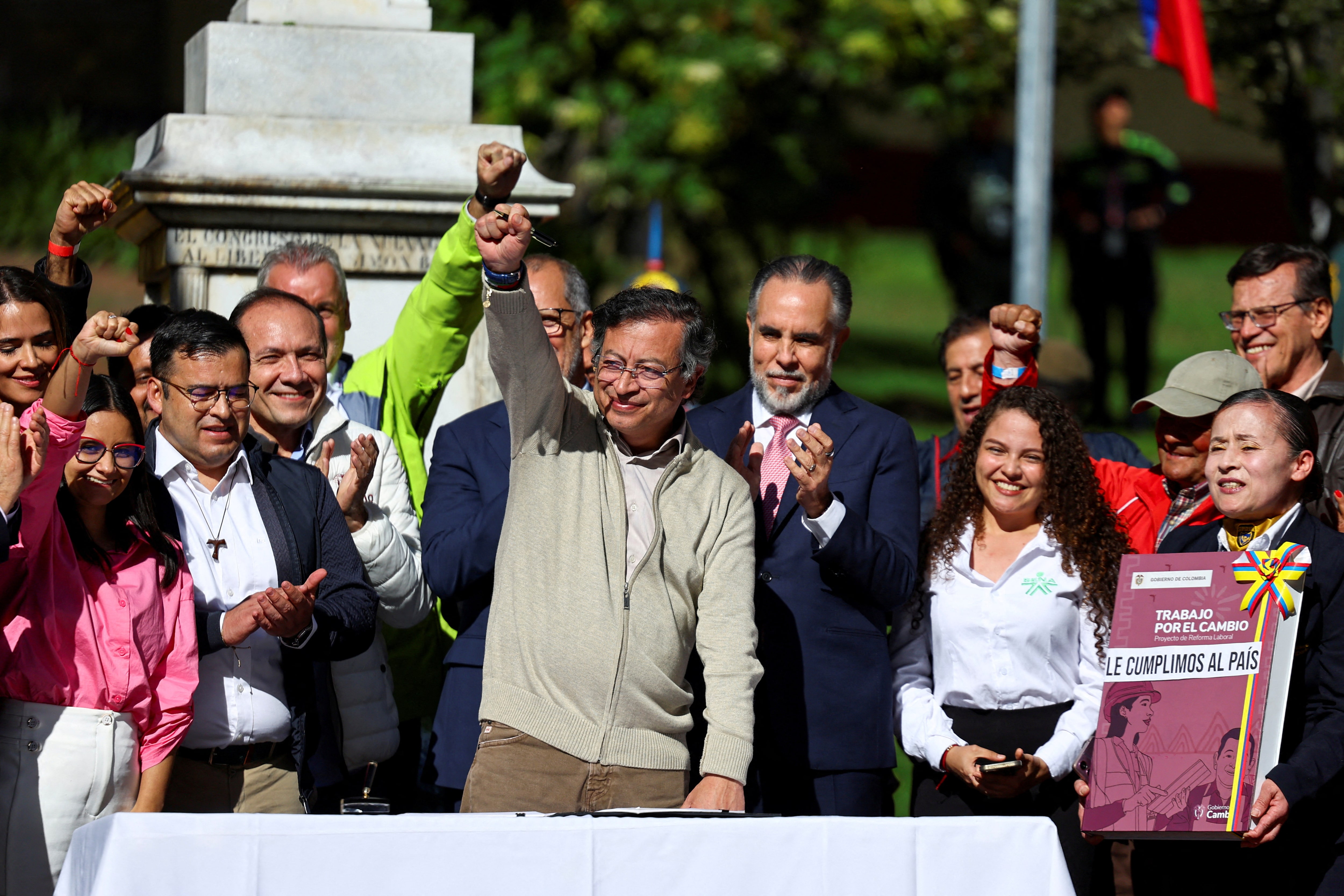 資料圖片。2025年6月25日,哥倫比亞總統古斯塔沃·佩特羅在波哥大簽署其政府制定的勞工改革文本後舉起拳頭。路透社/路易莎·岡薩雷斯 購買授權 權利, 打開新標籤頁波哥大,6月28日(路透社)— 哥倫比亞眾議院週六第二次通過了一項養老金改革法案,該法案此前被憲法法院退回以彌補程序缺陷,經過新的討論和投票後得以實施。
