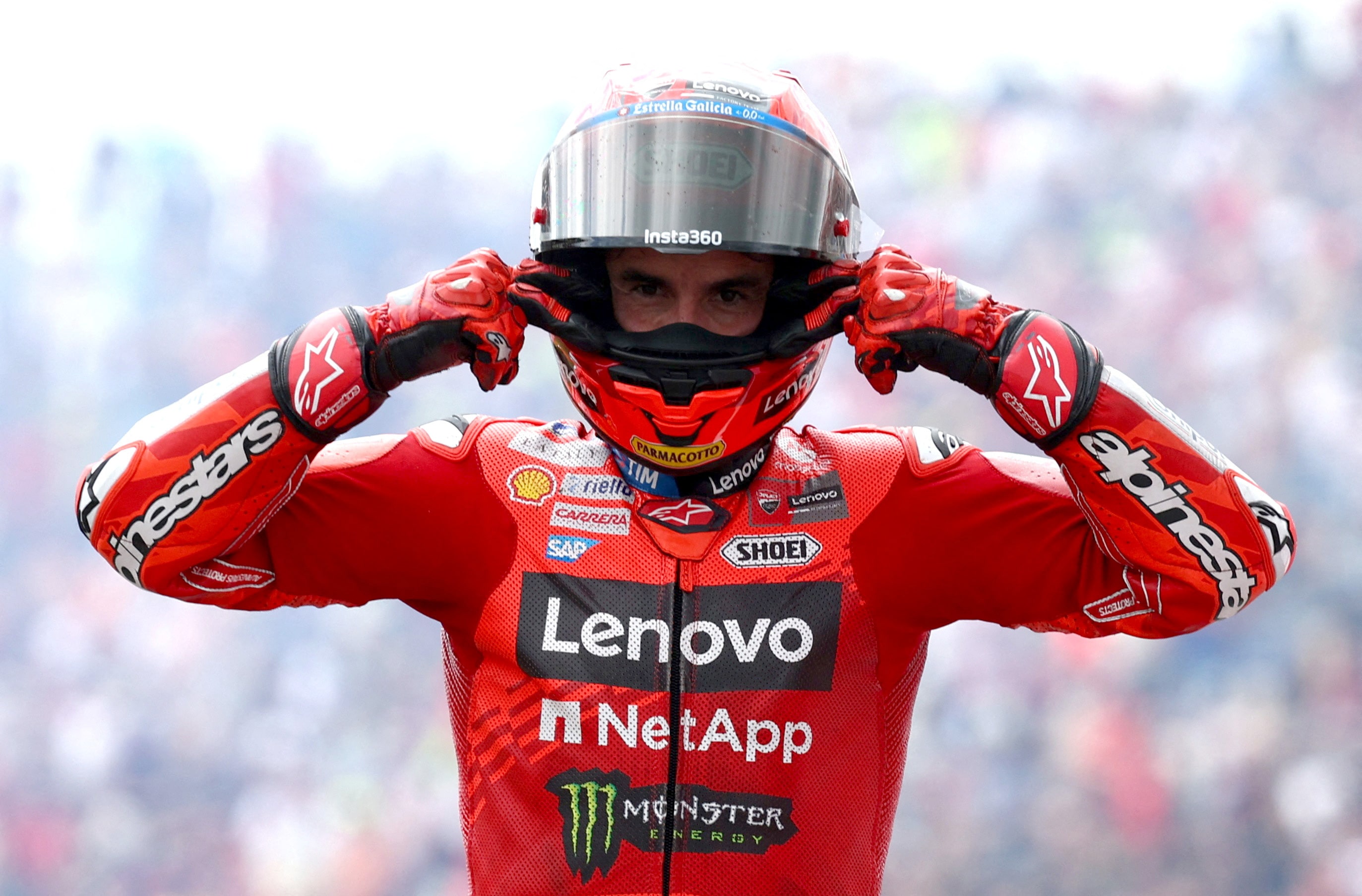 MotoGP荷蘭大獎賽 - 荷蘭阿森TT賽道 - 2025年6月29日 杜卡迪聯想車隊馬克·馬奎茲在贏得荷蘭大獎賽後慶祝 路透社/Yves Herman 購買授權許可,打開新標籤頁路透社阿森6月29日電 - 杜卡迪車手馬克·馬奎茲週日為弟弟亞歷克斯進行了激烈辯護,譴責那些質疑其弟弟在本賽季衝刺賽和正賽中是否故意避免挑戰他奪冠的批評者。