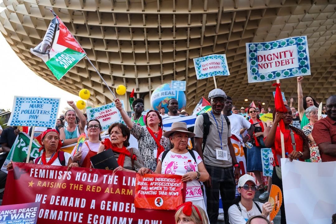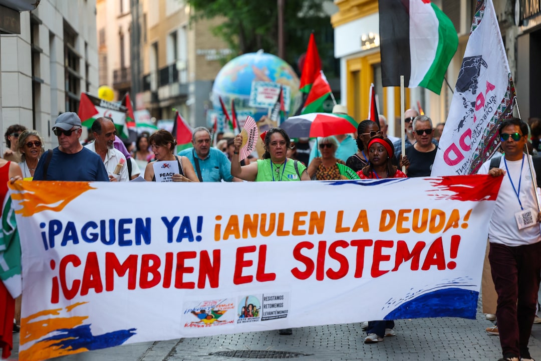 圖1/5:2025年6月29日,西班牙塞維利亞,在第四屆發展籌資國際會議前夕,民眾參加遊行要求建立聯合國主導的主權債務解決框架。路透社/Claudia Greco