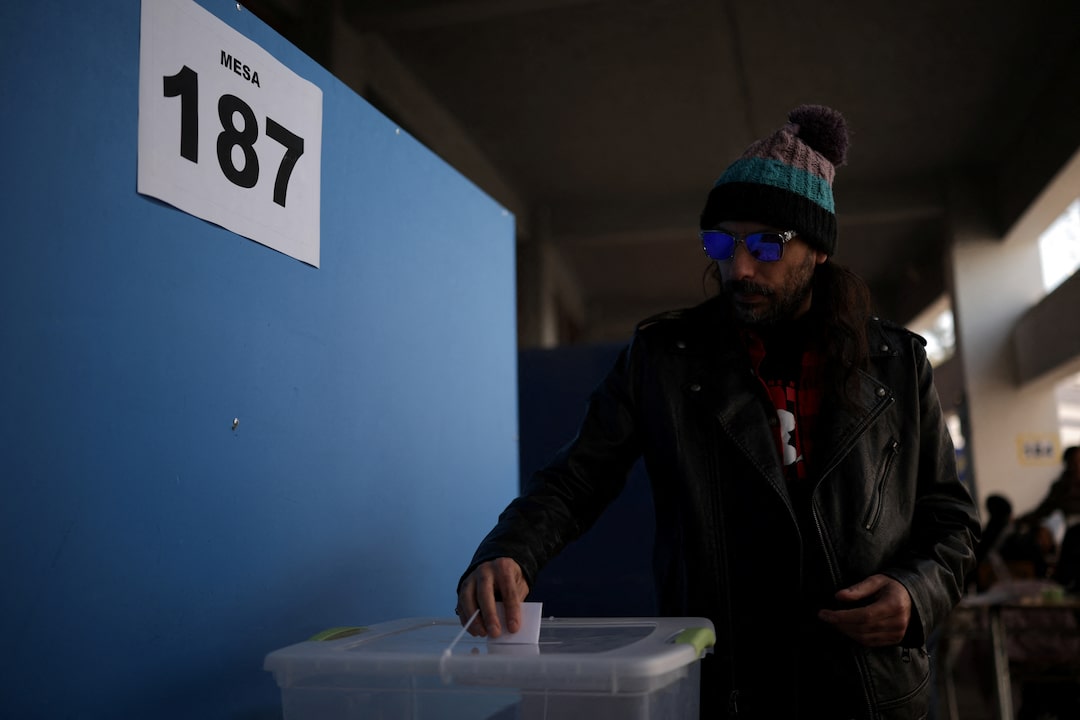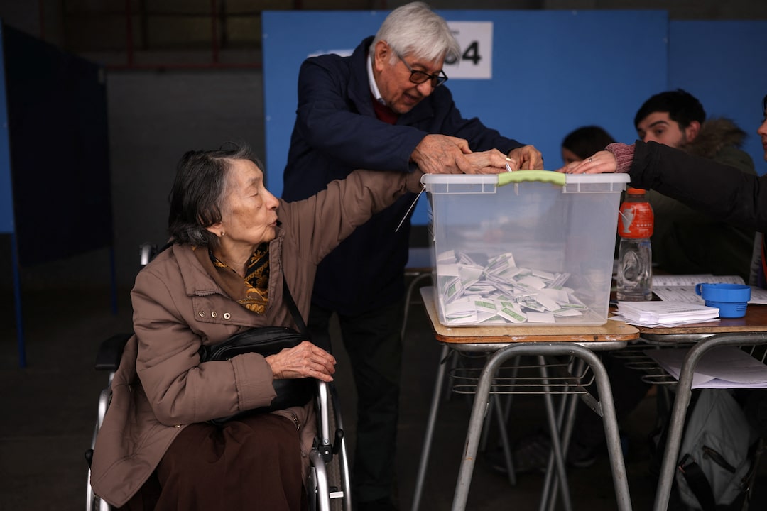 圖1/5 2025年6月29日,智利聖地亞哥,一名婦女舉起兒子在初選投票箱中投票,以選出總統候選人。路透社/Pablo Sanhueza