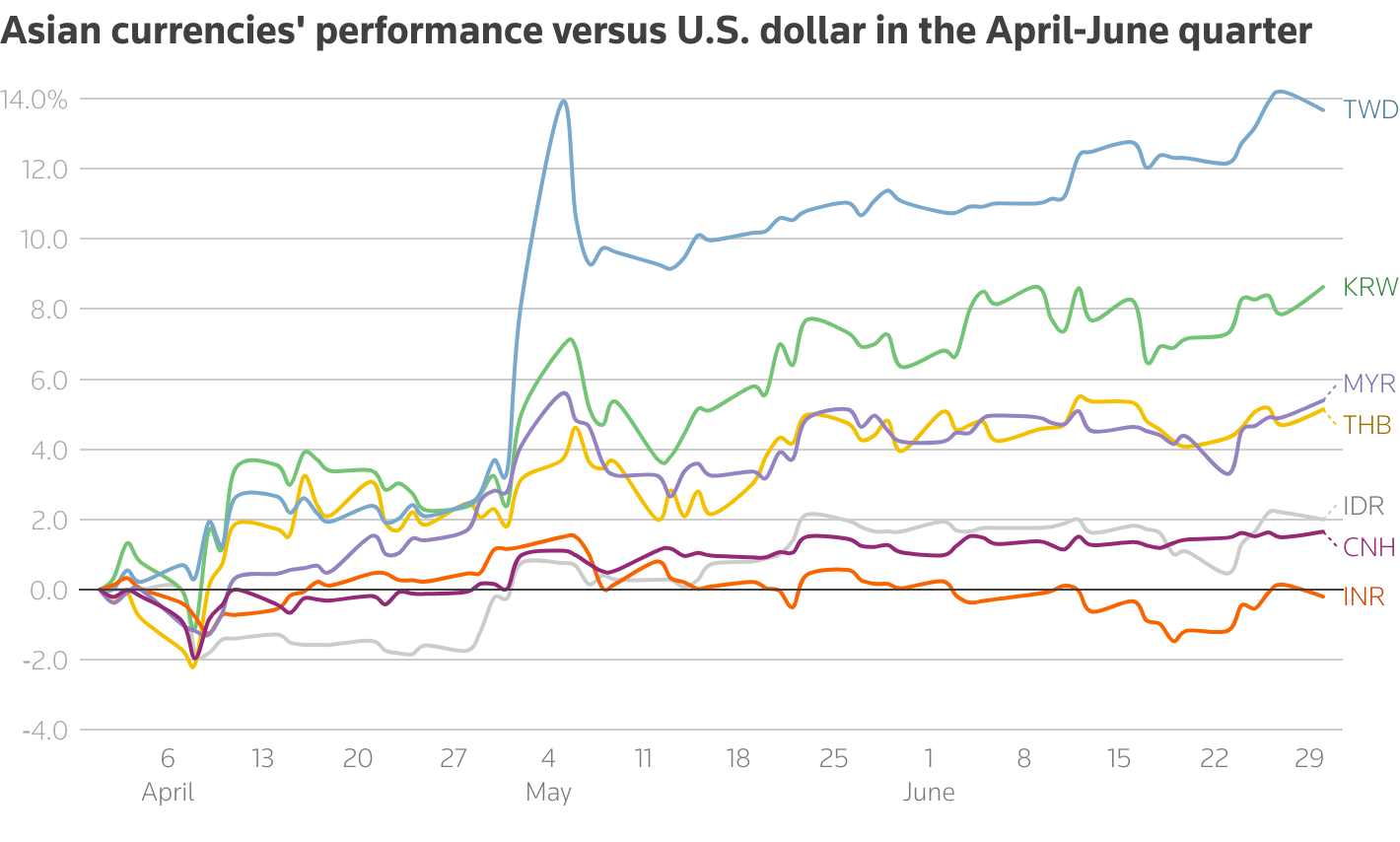 顯示4-6月季度亞洲貨幣兑美元相對錶現的折線圖