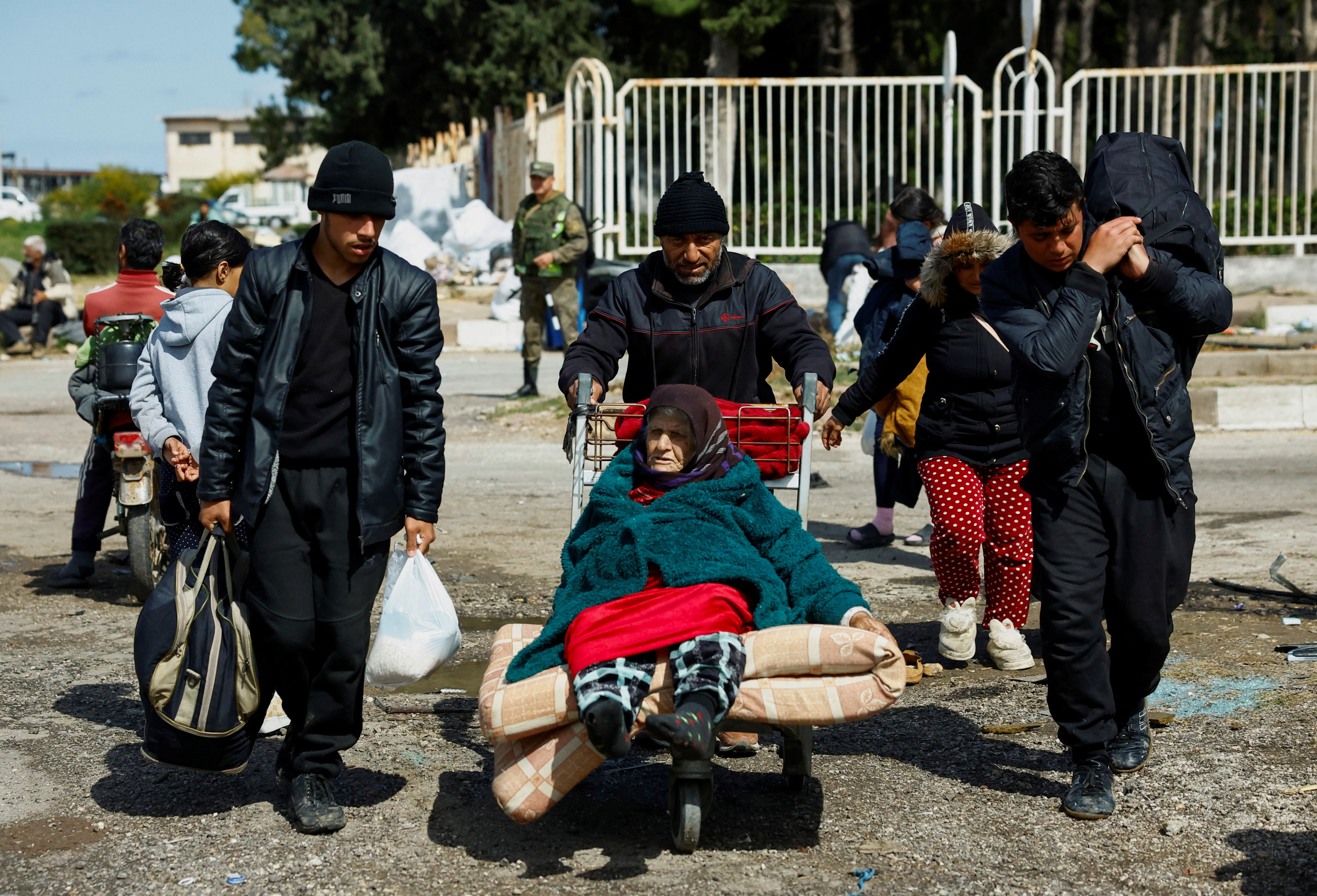 2025年3月20日,敍利亞西部拉塔基亞省赫梅米姆空軍基地,一名男子用機場行李推車推着一位老婦人。此前親政府武裝對其村莊發動致命襲擊後,數千名阿拉維派家庭逃往該地避難。路透社調查發現,這場暴力事件造成近1500人死亡……購買授權許可,打開新標籤頁閲讀更多敍利亞拉塔基亞,6月30日 - 路透社調查還原了3月7日至9日敍利亞地中海沿岸阿拉維派大屠殺的經過,確認襲擊者的指揮鏈直接延伸至與大馬士革新領導人共事的官員。調查發現,針對這一長期與阿薩德政府關聯的宗教少數派,在40個不同地點發生的報復性殺戮、暴行和劫掠中,共有1479名敍利亞阿拉維派遇害,數十人失蹤。