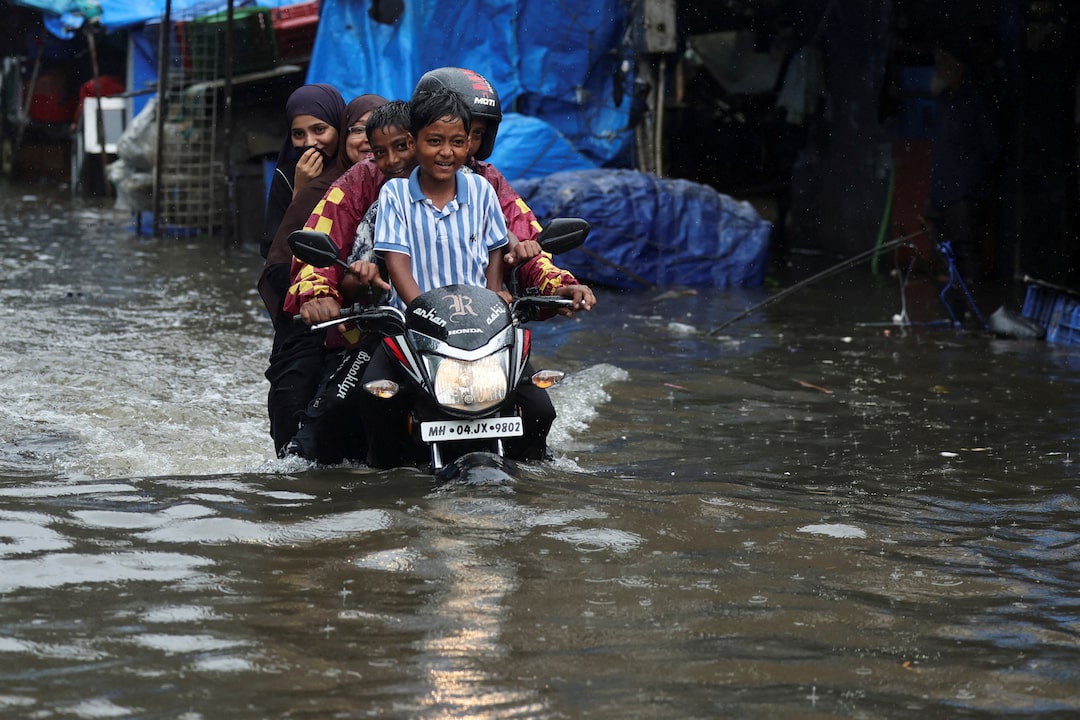 2025年5月26日,印度孟買遭遇強降雨後,人們騎着摩托車穿過積水的街道。路透社/Francis Mascarenhas/檔案照片
