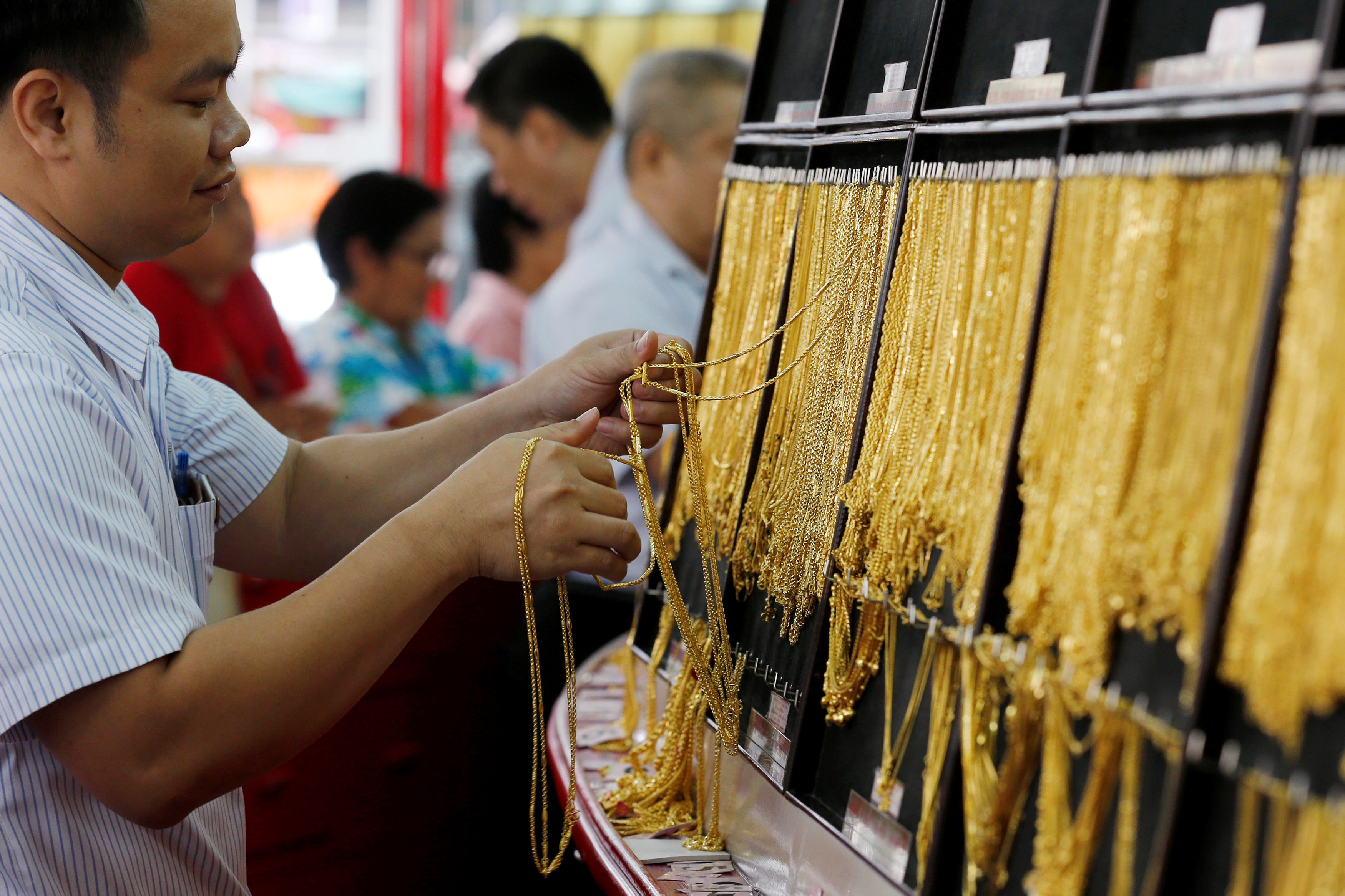 2016年6月8日,泰國曼谷唐人街一家金店內,銷售員正在為購買黃金的顧客挑選金鍊。路透社/柴瓦·蘇帕索姆購買授權許可,打開新標籤頁7月2日(路透社)——週三金價小幅走低,因投資者等待美國非農就業數據並評估美聯儲主席傑羅姆·鮑威爾對降息的謹慎態度,不過美元走弱幫助限制了以美元計價黃金的跌幅。