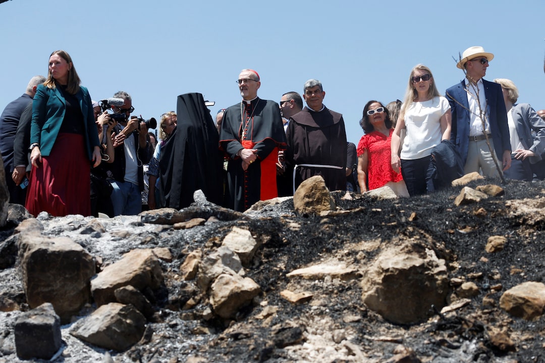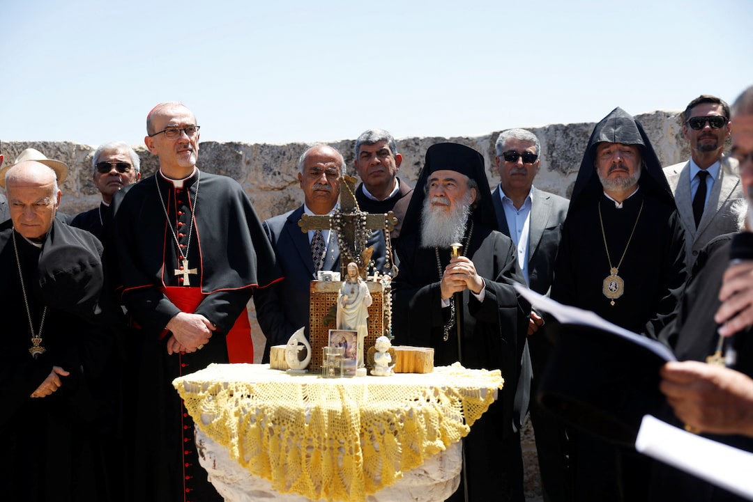圖集1/5:2025年7月14日,在定居者襲擊事件後,教會領袖和外交使團訪問了被以色列佔領的約旦河西岸基督教村莊泰比鎮。路透社/穆罕默德·託羅克曼