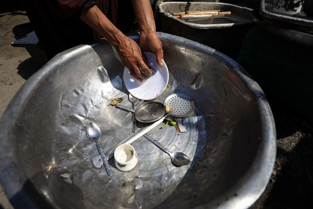 在帳篷裏,這家人試圖通過清掃保持衞生。但缺乏足夠清潔用水,有時他們連續數天都無法清洗簡陋餐食後的碗碟。