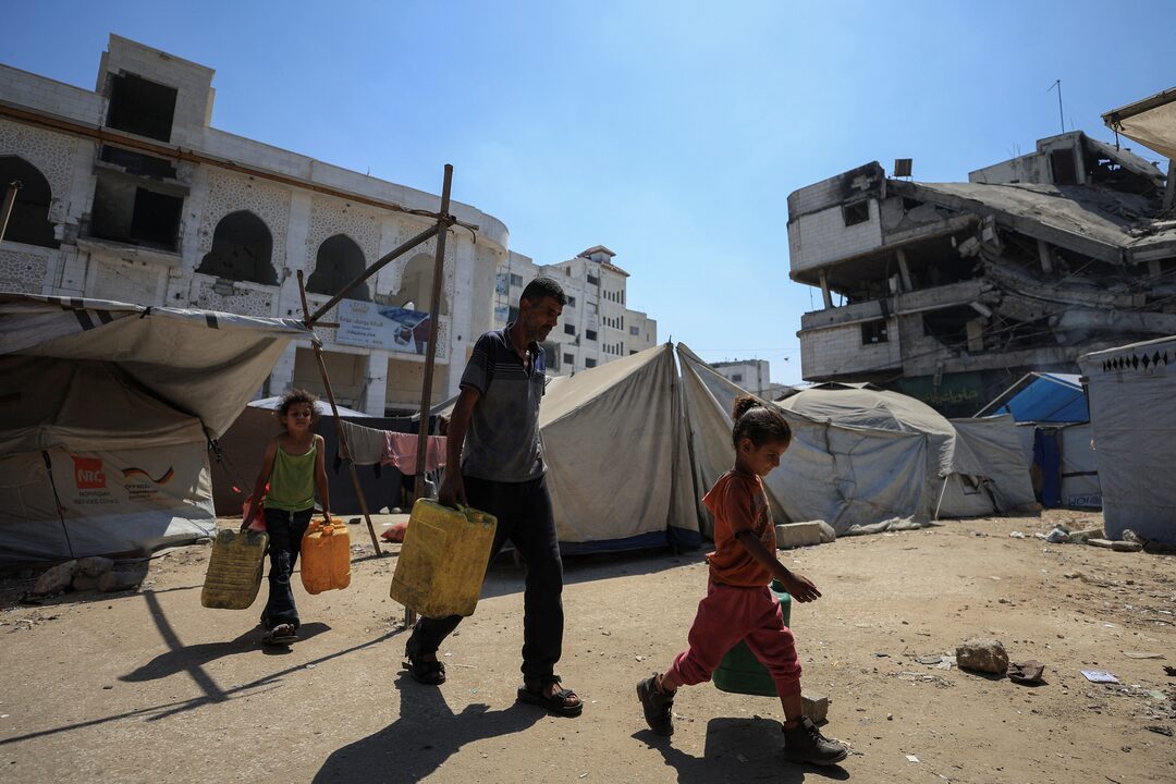 2025年7月14日,流離失所的巴勒斯坦男子阿克拉姆·阿爾-馬納斯拉與他的孩子們在加沙城水源短缺的情況下前往分配點取水。路透社/Dawoud Abu Alkas 購買授權 許可,打開新標籤頁加沙城,7月14日(路透社)——阿爾-馬納斯拉一家每天艱難地前往加沙的一個分配點取水,但很少能獲得足夠的飲用水和洗滌用水。就在週日,以色列軍方稱一次襲擊偏離目標,導致八人喪生。這家人住在加沙城一座被炸燬的混凝土建築廢墟旁的帳篷營地裏,他們表示,由於缺乏清潔用水,孩子們已經出現腹瀉和皮膚病症狀,他們擔心情況會進一步惡化。