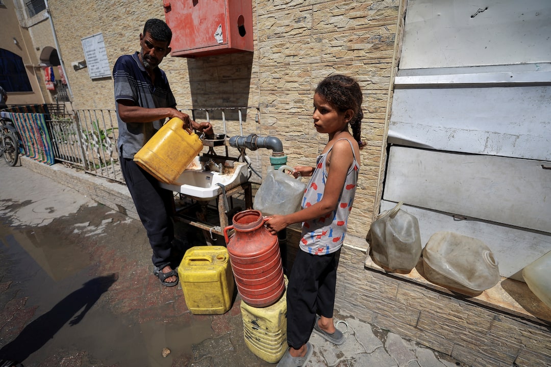 週一他帶着三個女兒前往當地取水點,在加沙酷熱的夏日裏,每人提着兩個沉重的塑料容器,卻只接滿了兩桶——對於這個十口之家遠遠不夠。