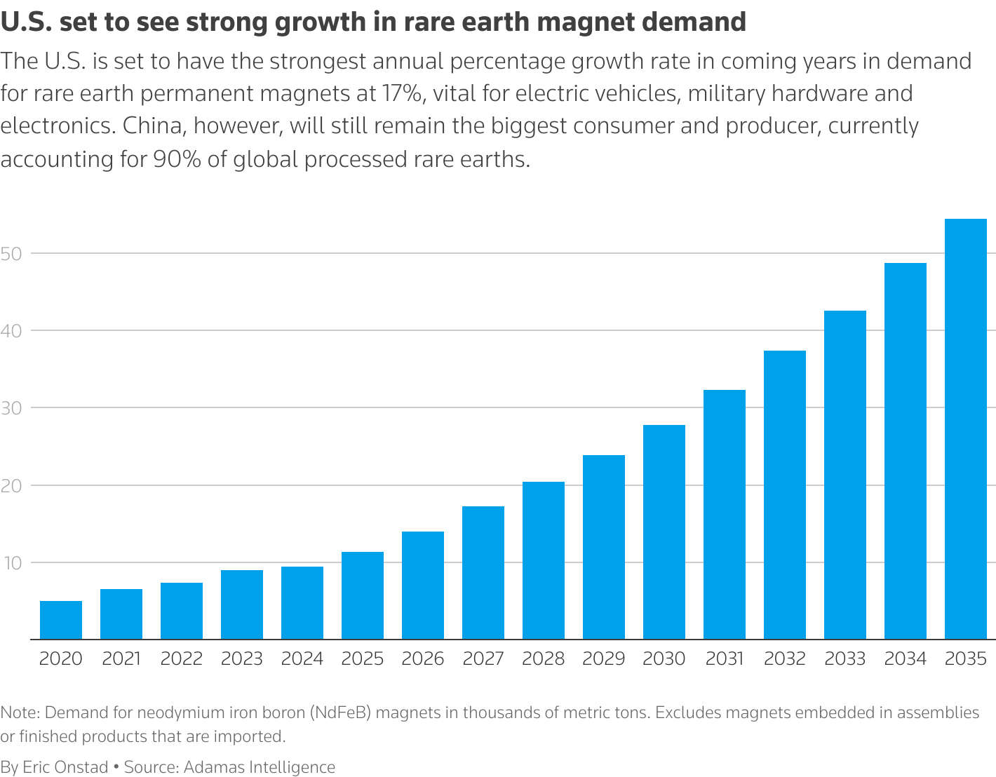 MP材料公司去年淨虧損6540萬美元,主要原因是中國的低價策略。該公司將在德克薩斯州的工廠初步將磁鐵年產量提升至1000公噸,隨後擴大到每年3000噸。根據上週四的協議,美國國防部將成為其最大股東,持股15%,MP將在美國建設第二個稀土磁鐵製造設施,最終每年新增7000噸產能。總產量將達到每年1萬噸,相當於2024年美國磁鐵消費量。