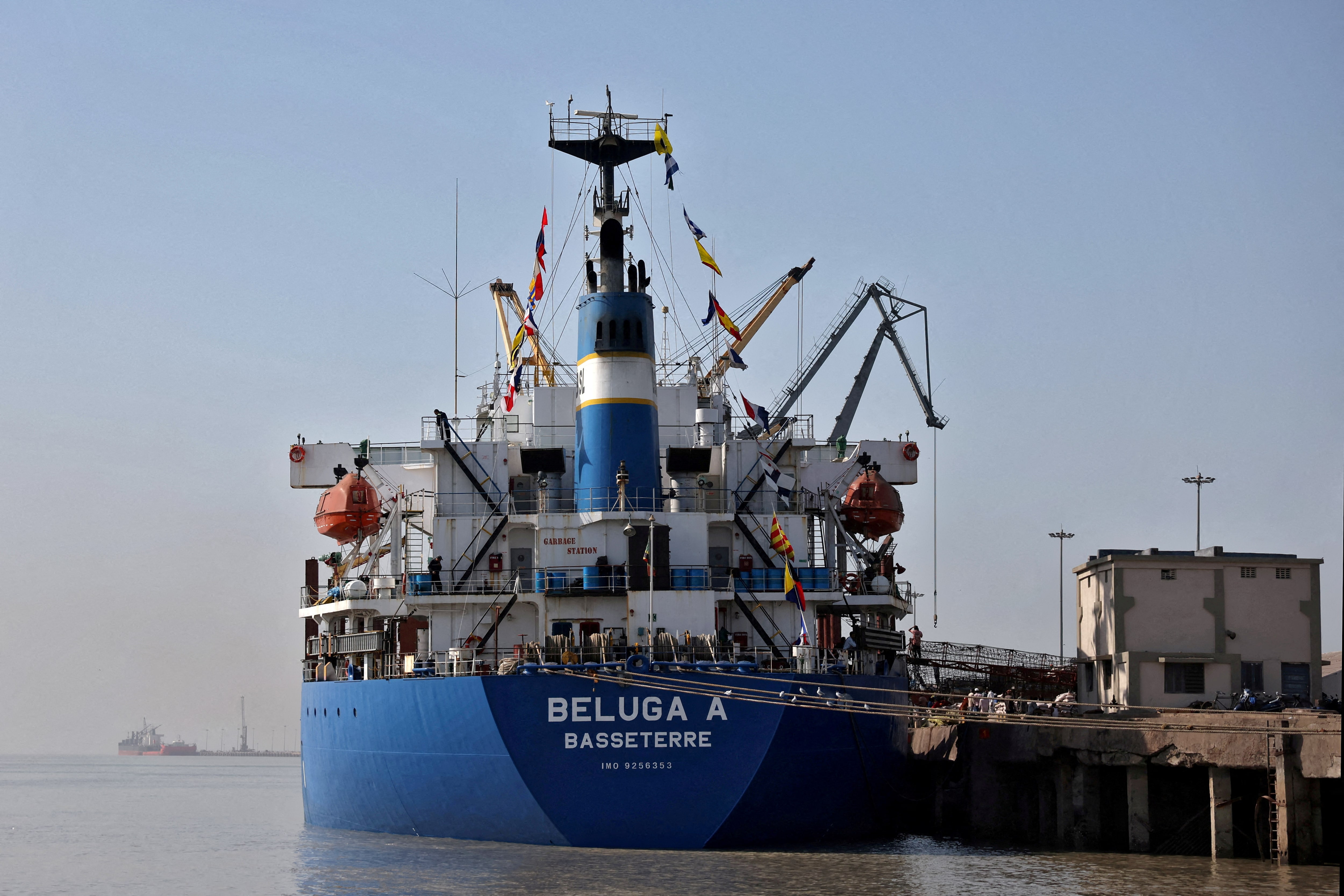 2025年4月5日,印度西部古吉拉特邦坎德拉的迪恩達亞爾港,裝載着出口利比亞糖的貨船Beluga A號停泊在此。路透社/Amit Dave/檔案照片購買授權權利,打開新標籤頁新德里,7月15日(路透社) - 根據路透社基於週二由商業和工業部發布的進出口數據計算,印度6月份的商品貿易逆差(INTRD=ECI),打開新標籤頁為187.8億美元。根據路透社的一項調查,經濟學家此前預計6月份的貿易逆差為222.4億美元,而前一個月為218.8億美元。