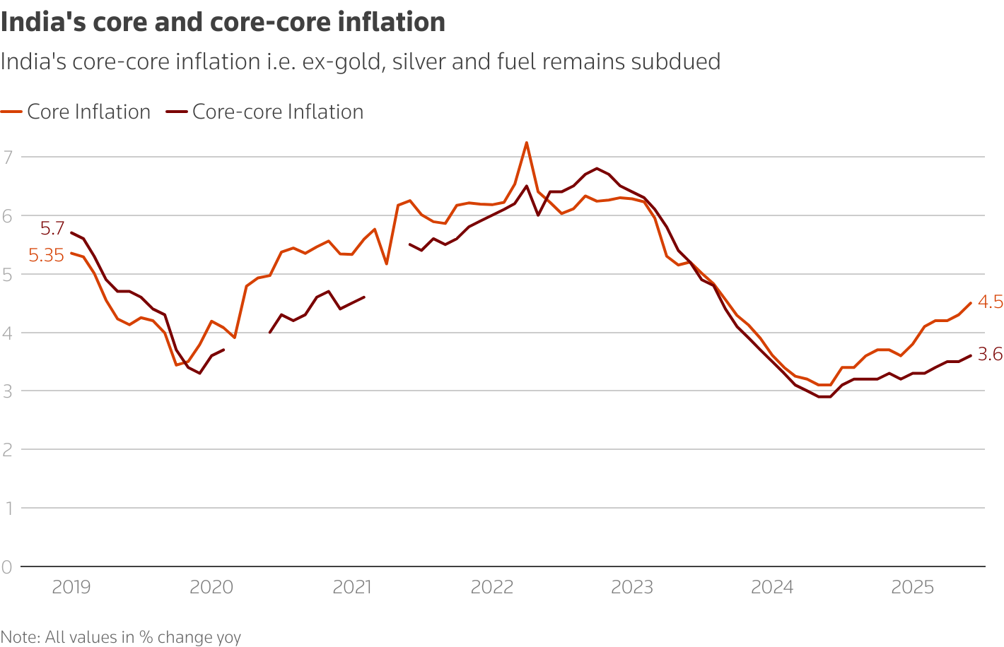 6月整體通脹下降的同時,核心通脹(剔除黃金、白銀和燃料價格後)仍低於4%,表明基礎消費疲軟,可能需要貨幣政策提供更多支持,分析師指出。通過路透社印度簡報獲取印度最新資訊及其全球影響。立即訂閲
