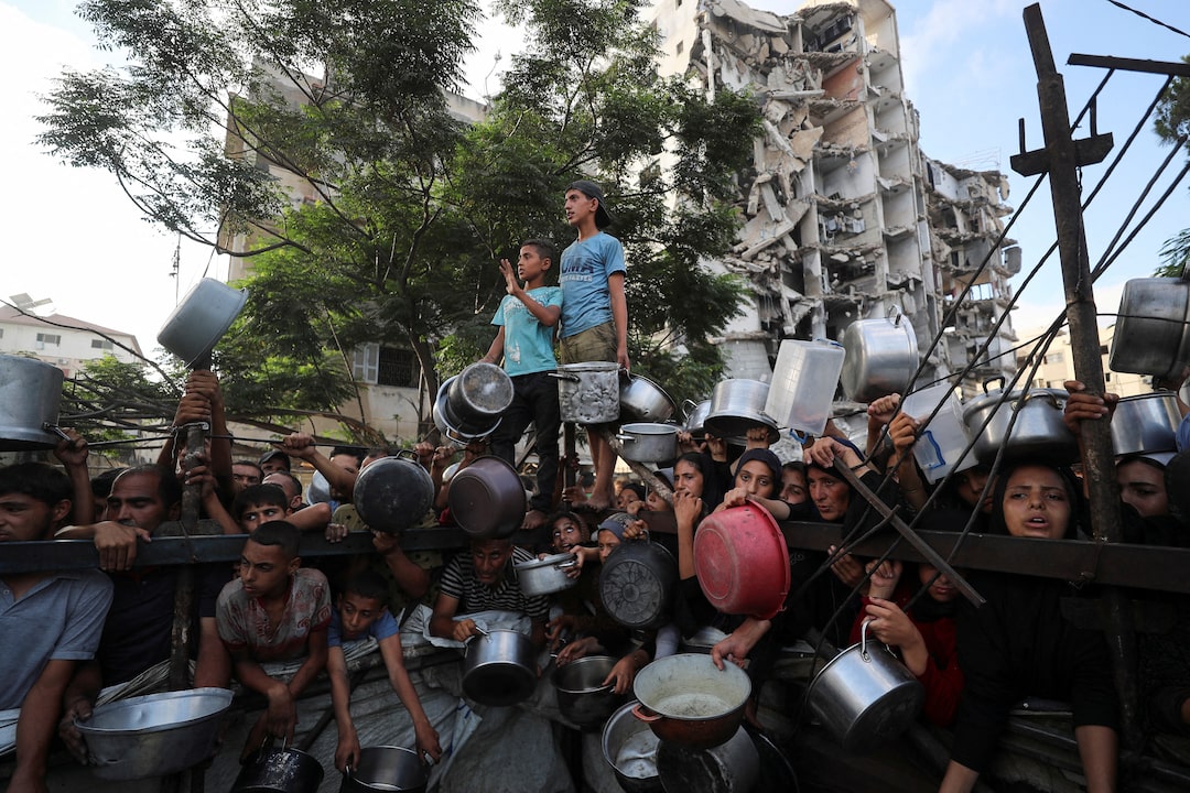 圖集1/6:2025年7月14日,加沙城,巴勒斯坦人在飢餓危機中等待慈善廚房分發食物,背景是一棟被毀的建築。路透社/Mahmoud Issa